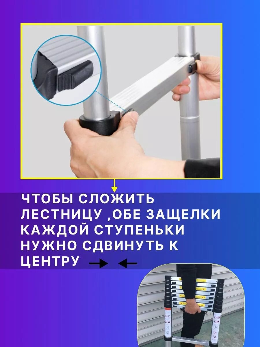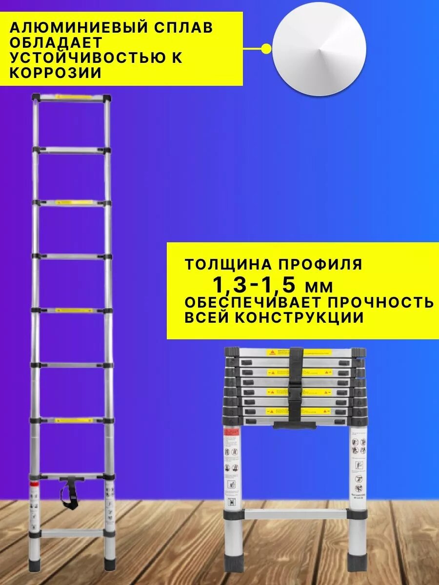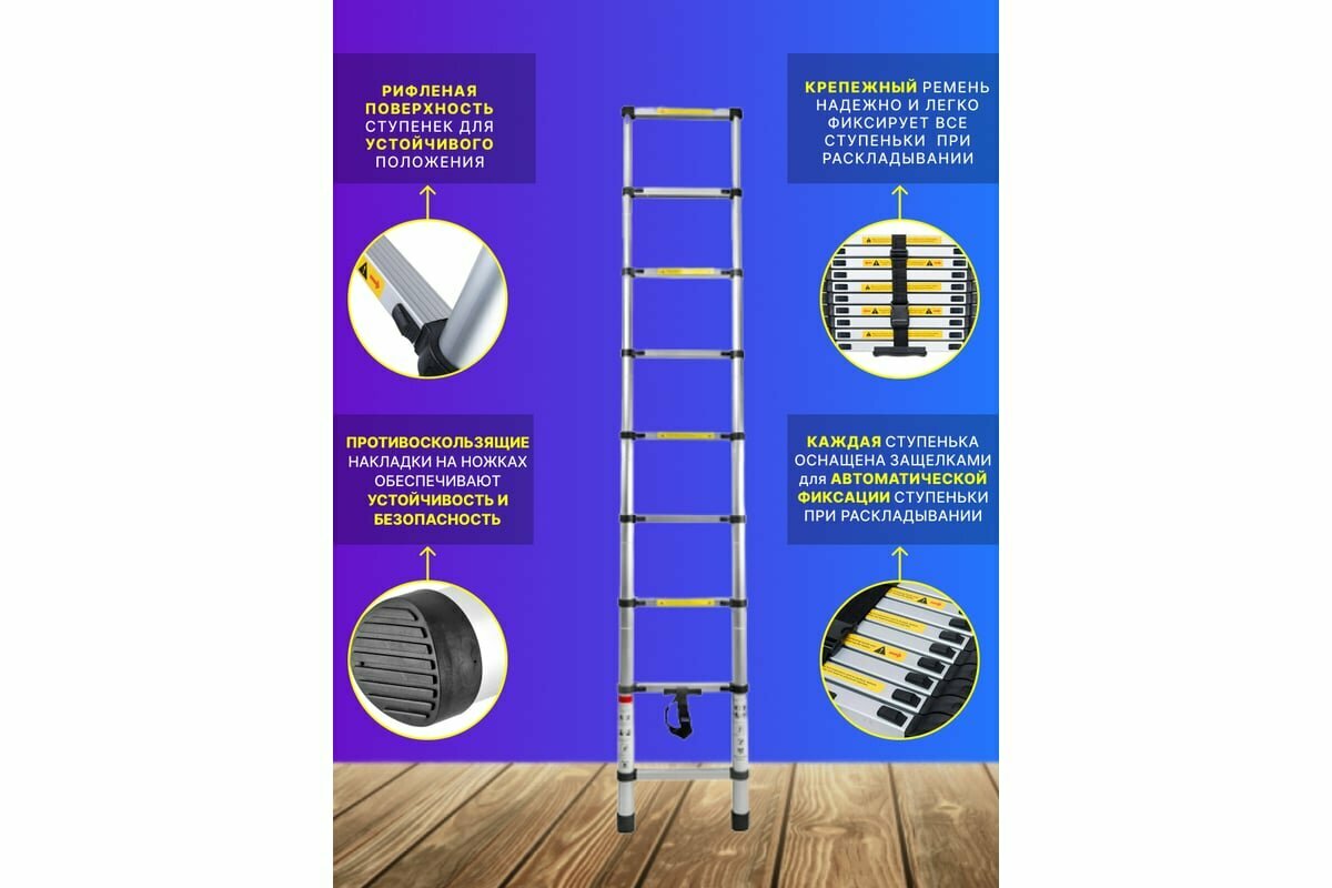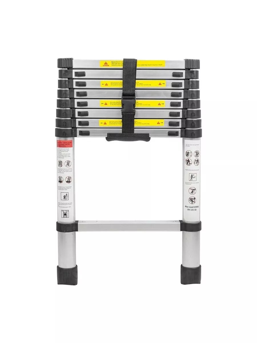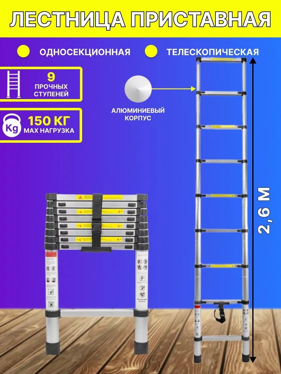 Лестница-стремянка телескопическая алюминиевая двухсекционная (2.6+2.6м,9+9ступенек, max нагрузка 150кг, вес 13.0кг)