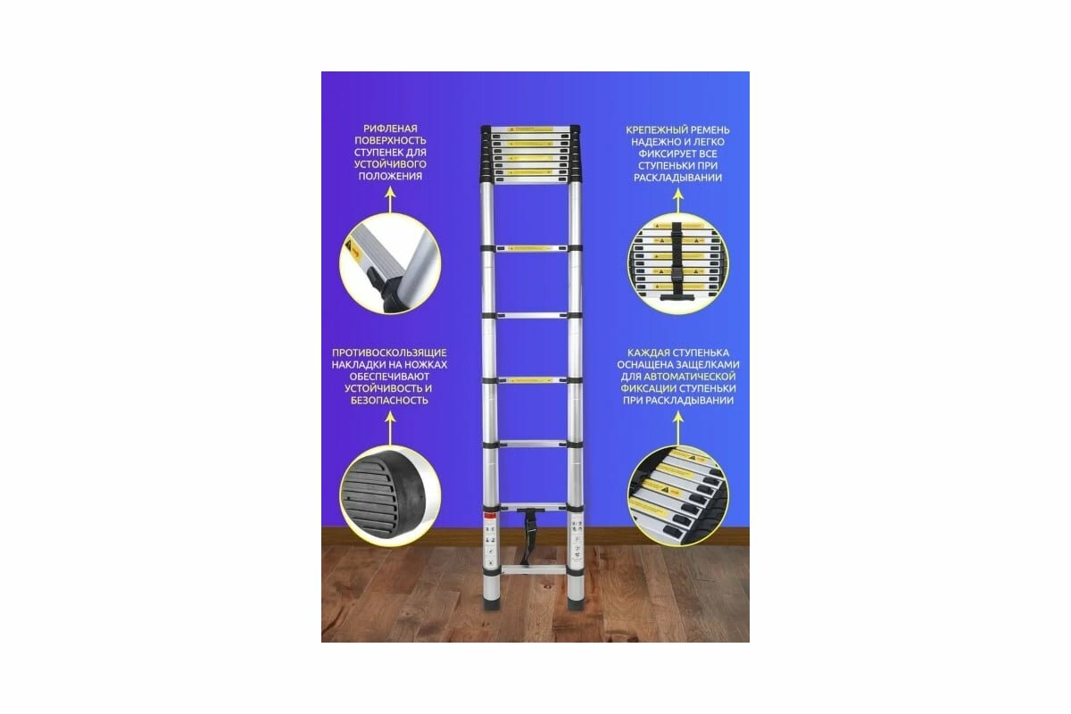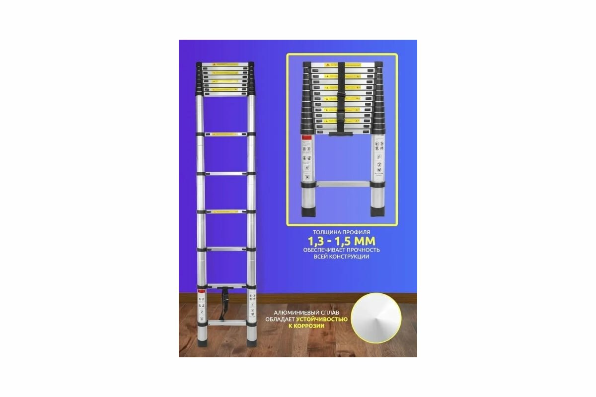 Лестница-стремянка телескопическая алюминиевая двухсекционная (2.6+2.6м,9+9ступенек, max нагрузка 150кг, вес 13.0кг)