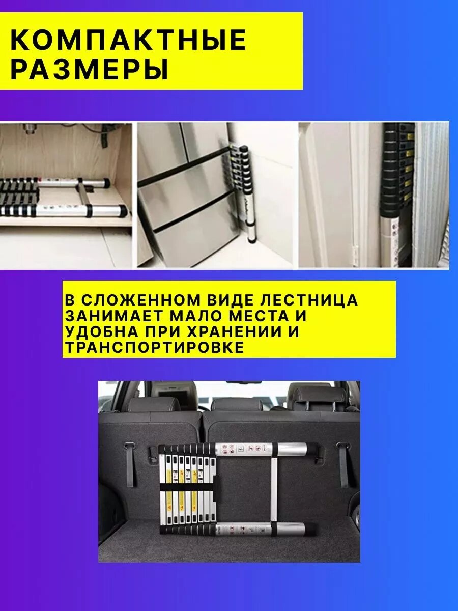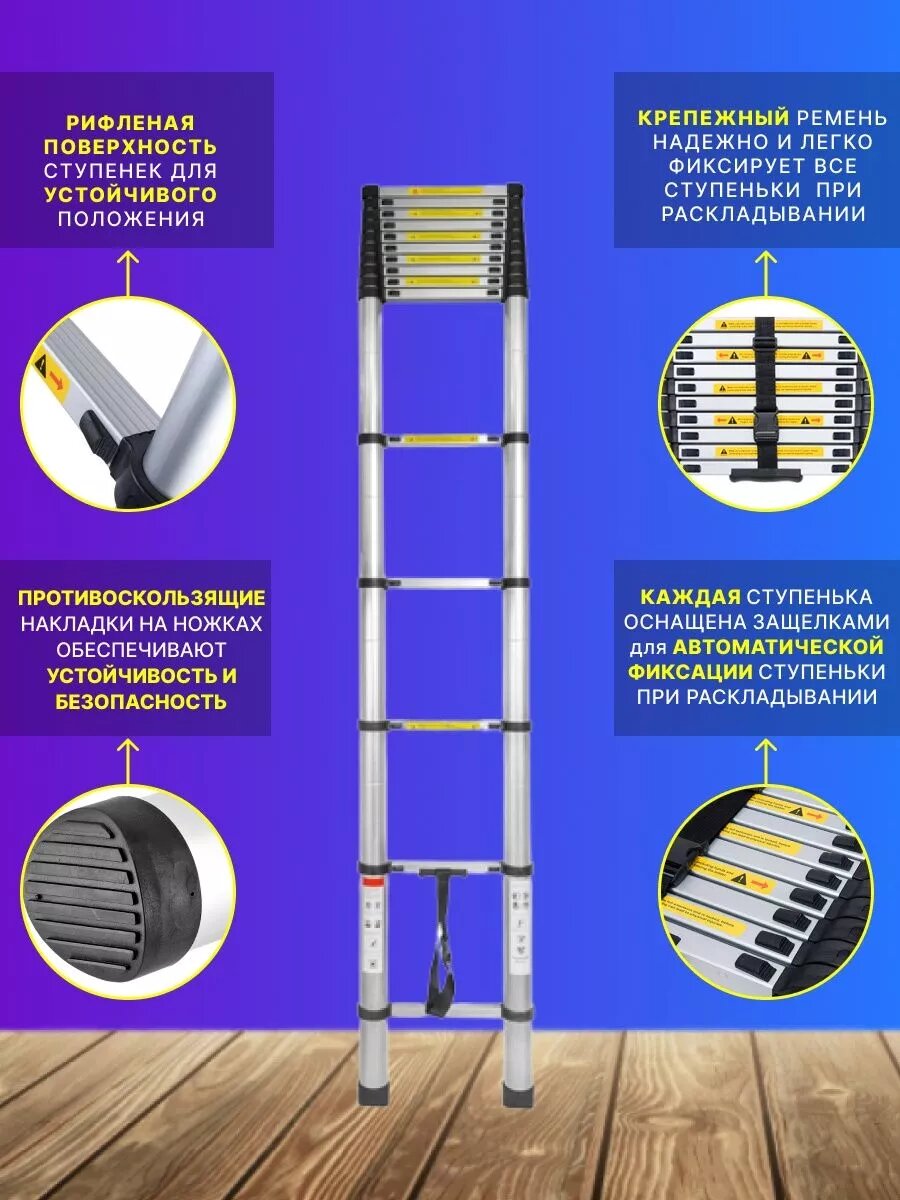 Лестница-стремянка телескопическая алюминиевая двухсекционная (2.6+2.6м,9+9ступенек, max нагрузка 150кг, вес 13.0кг)