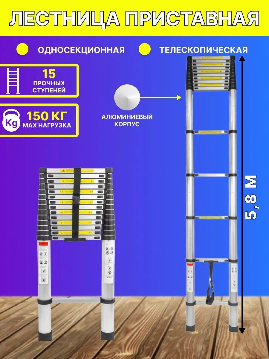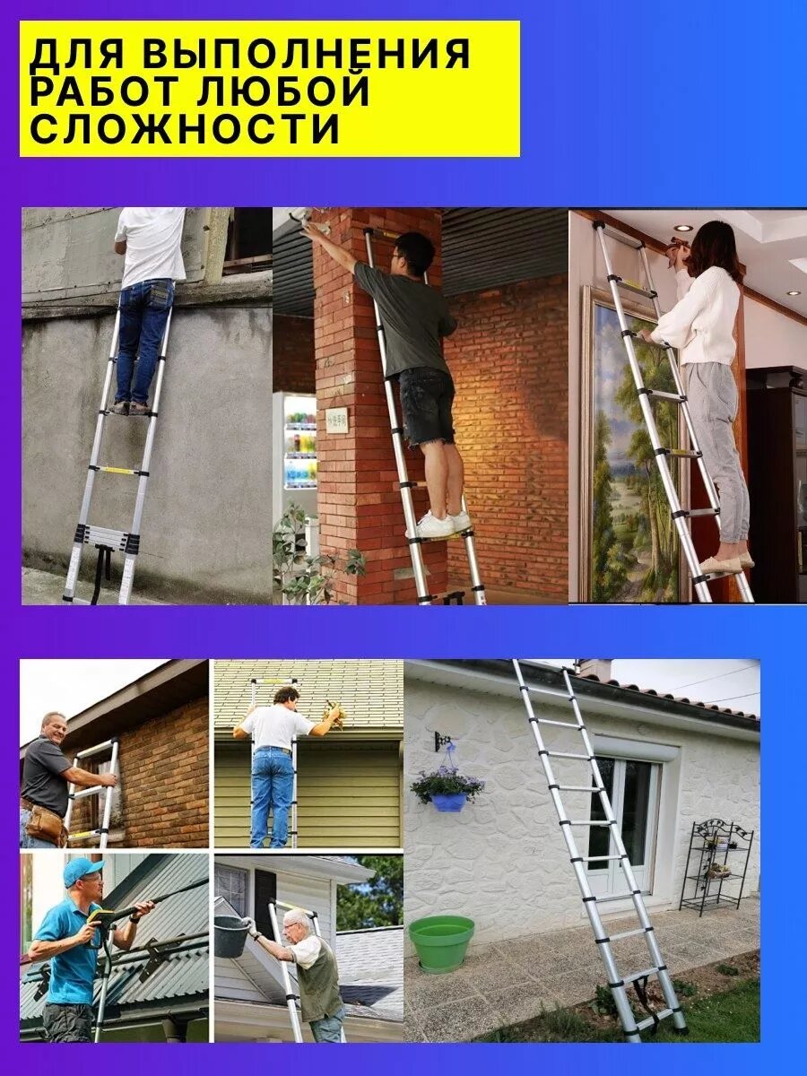 Лестница-стремянка телескопическая алюминиевая двухсекционная (2.9+2.9м,10+10ступенек, max нагрузка 150кг, вес 14.5кг)