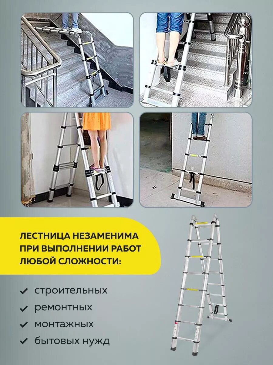 Лестница-стремянка телескопическая алюминиевая двухсекционная (2.9+2.9м,10+10ступенек, max нагрузка 150кг, вес 14.5кг)
