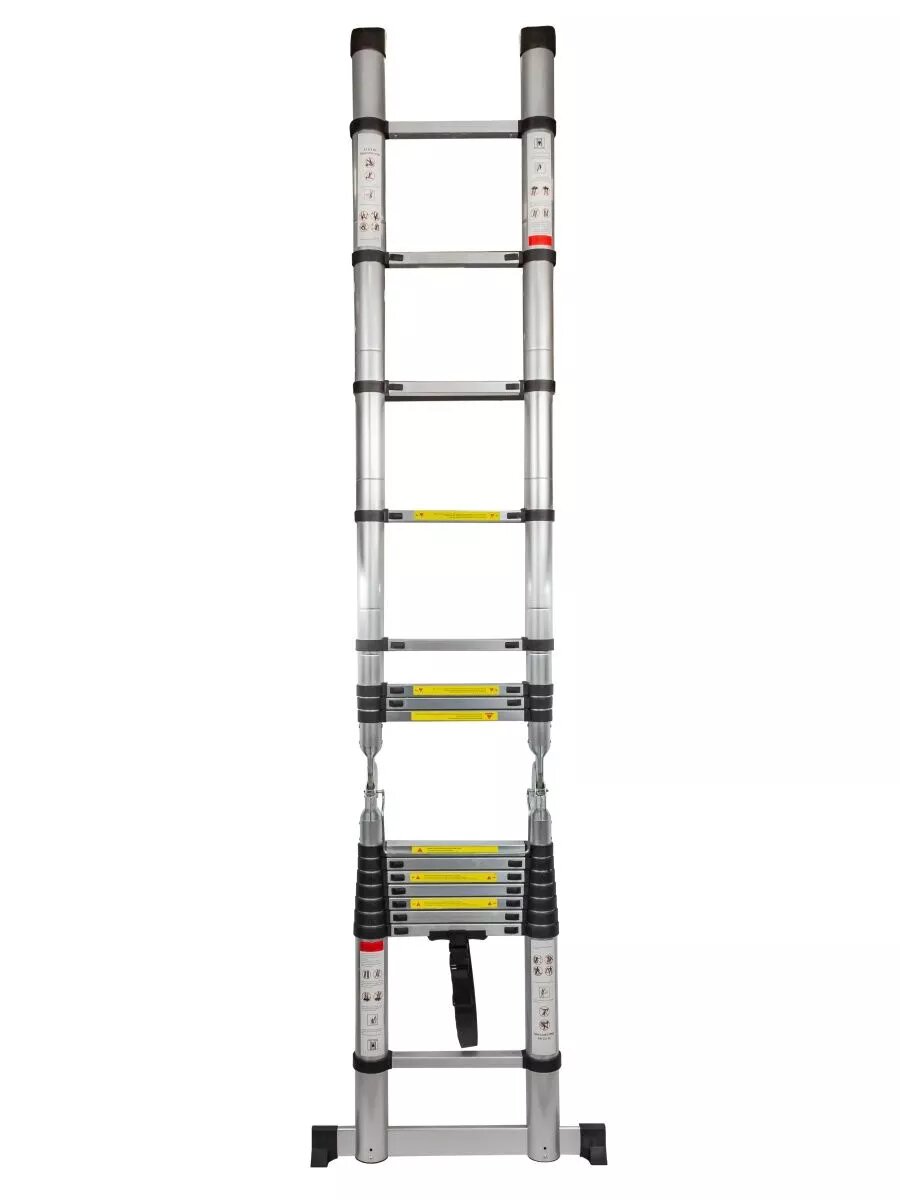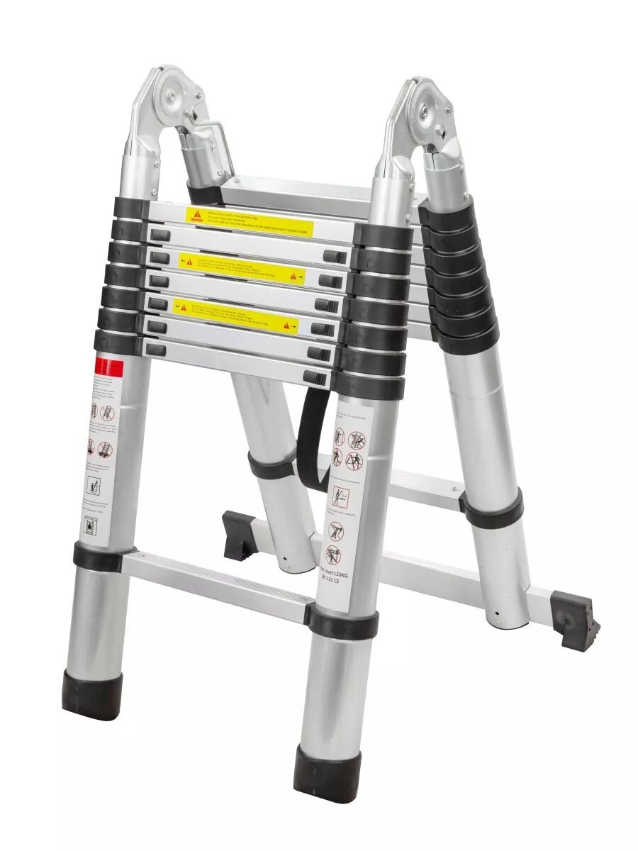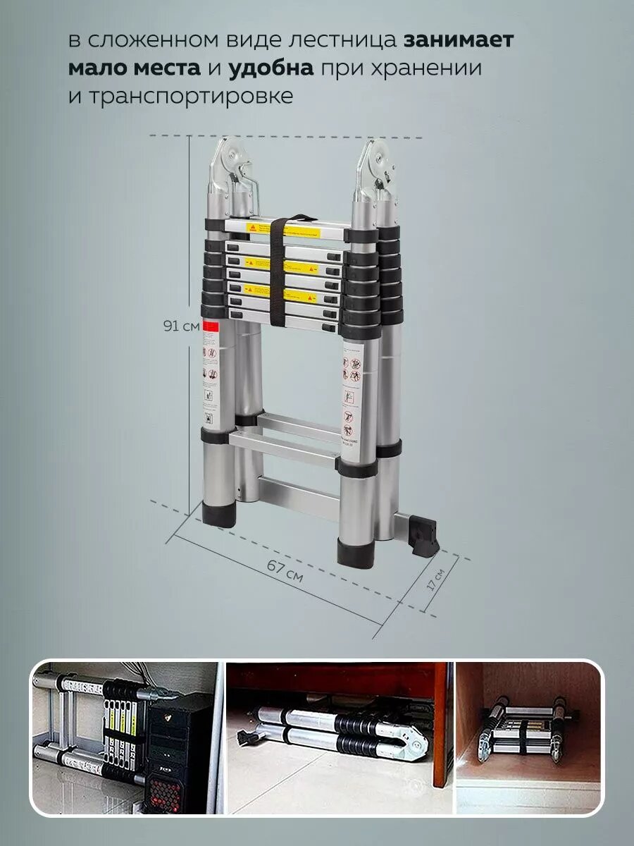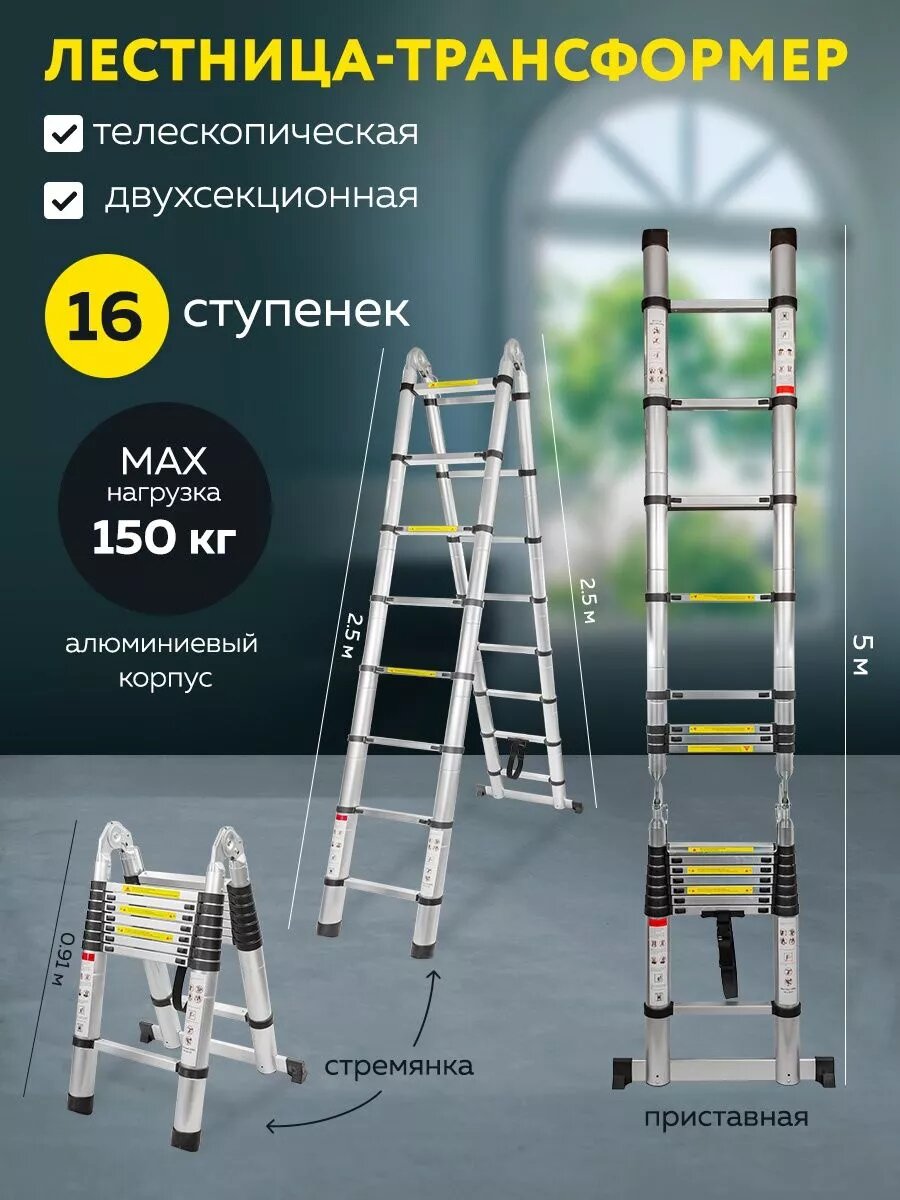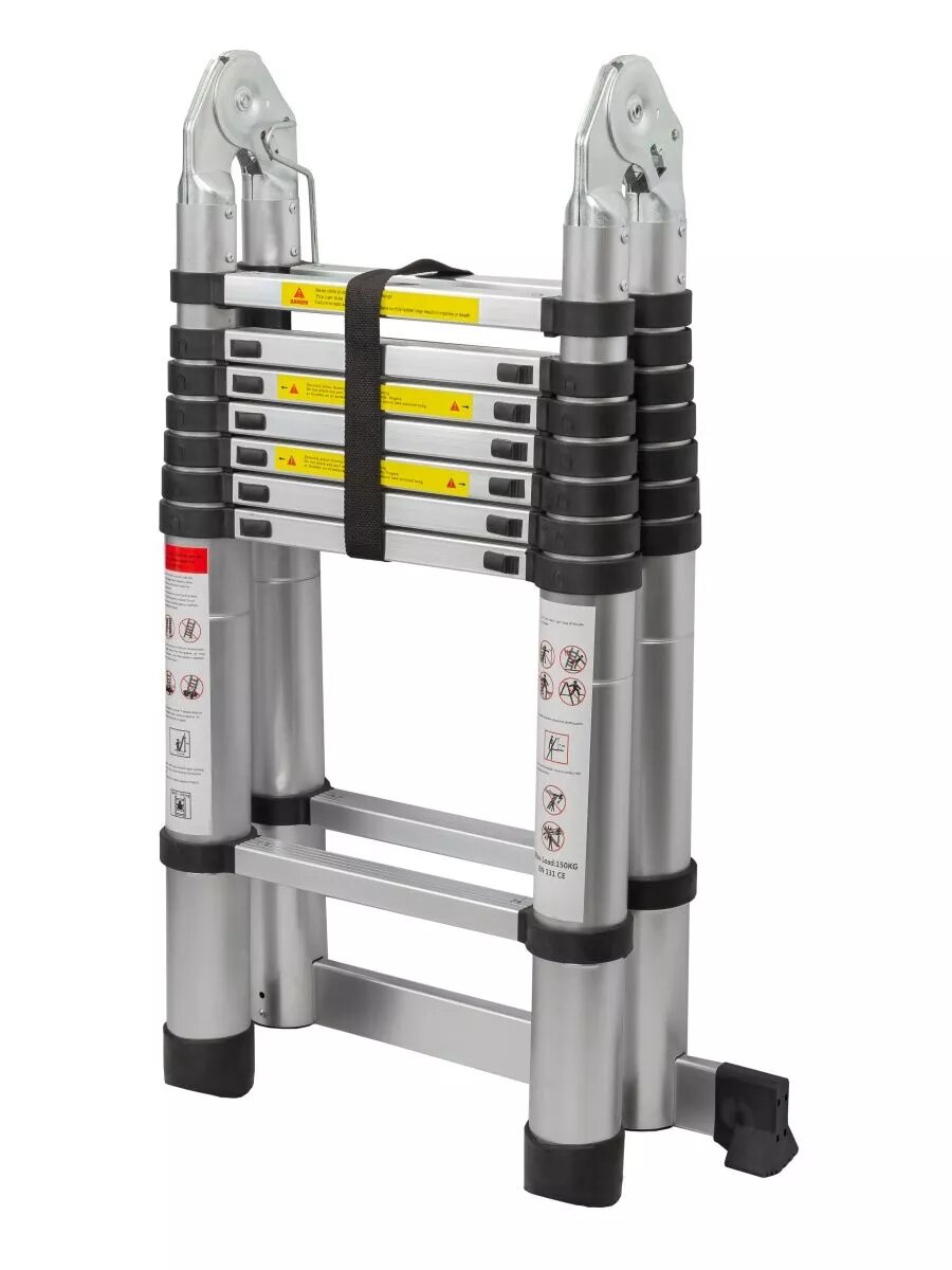 Лестница-стремянка телескопическая алюминиевая двухсекционная (2.6+2.6м,9+9ступенек, max нагрузка 150кг, вес 13.0кг)