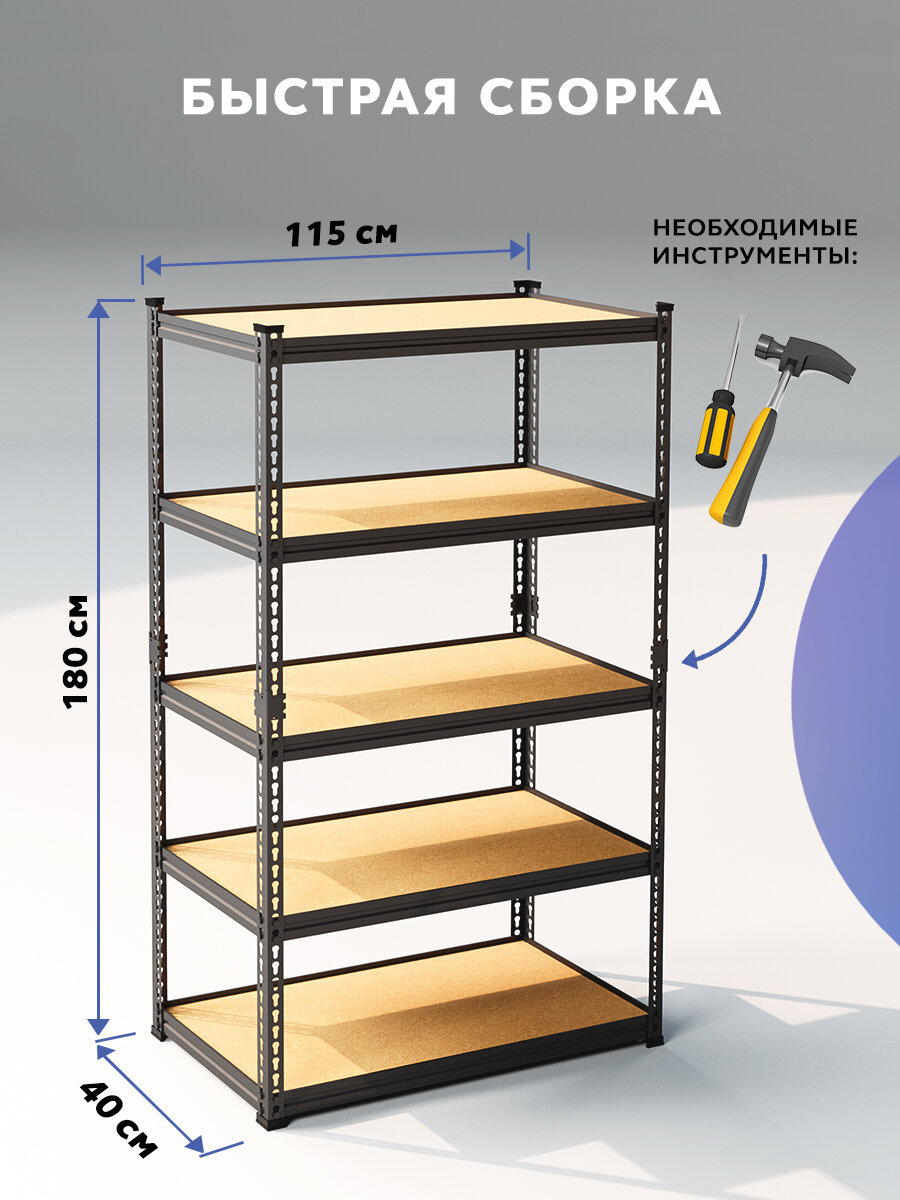 Стеллаж металлический безболтовой GASTRORAG GR-003-3, 5 полок МДФ, размеры 180х115х40 см, этажерка для кухни, мебель лофт, система хранения для дома, дачи и гаража