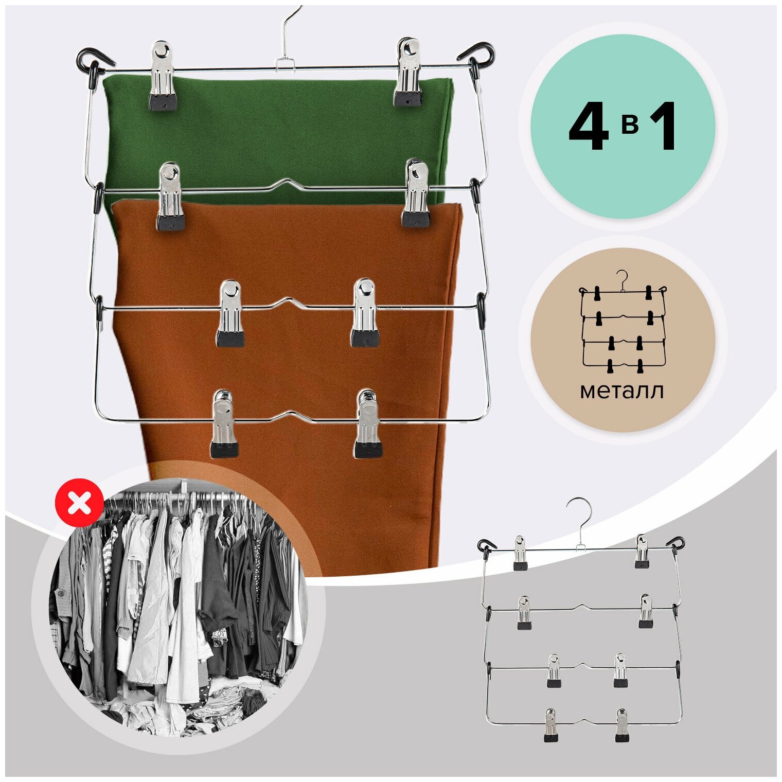 Вешалка-плечики для хранения одежды / вещей / брюк / костюма качели 4 секции металлическая с клипсами, Brabix