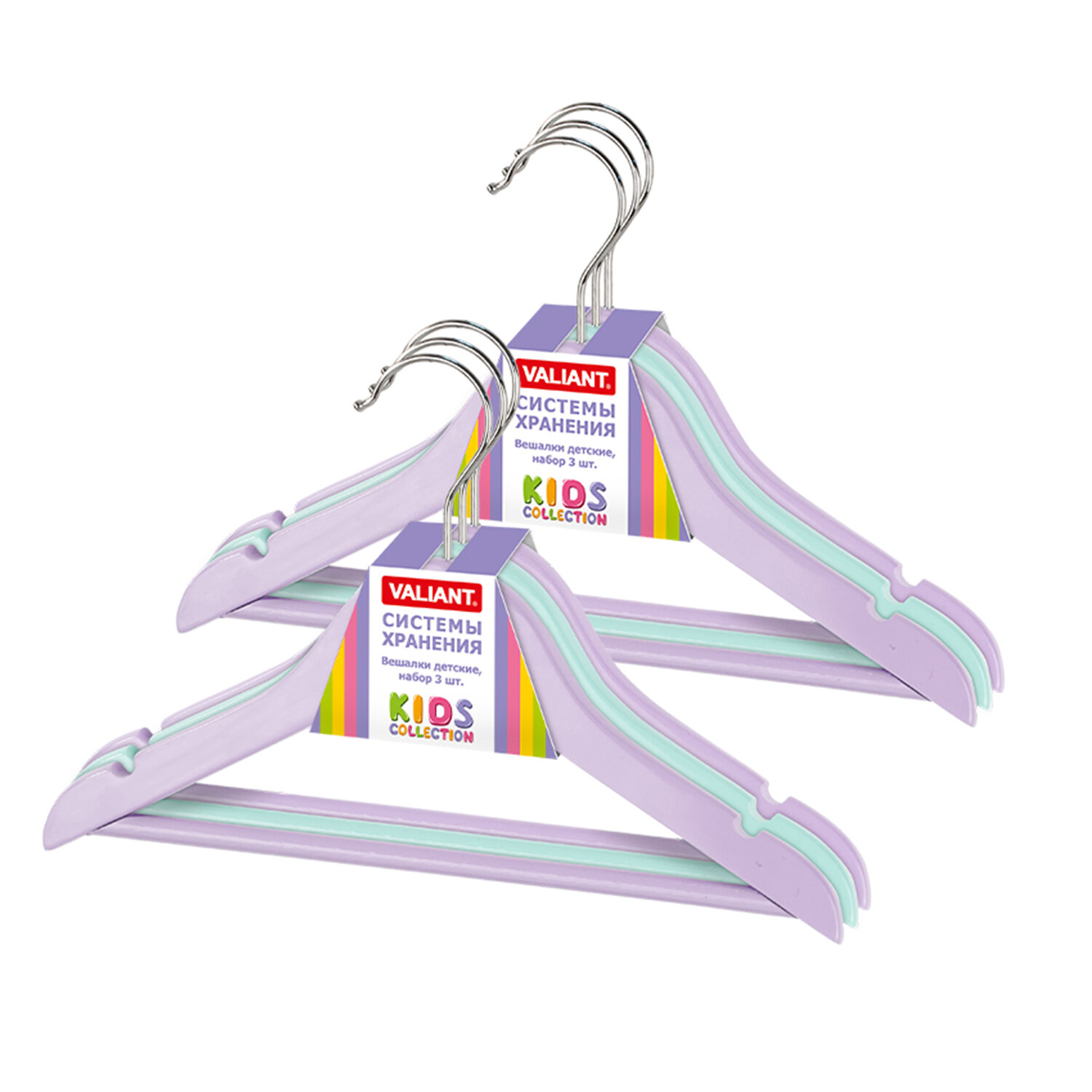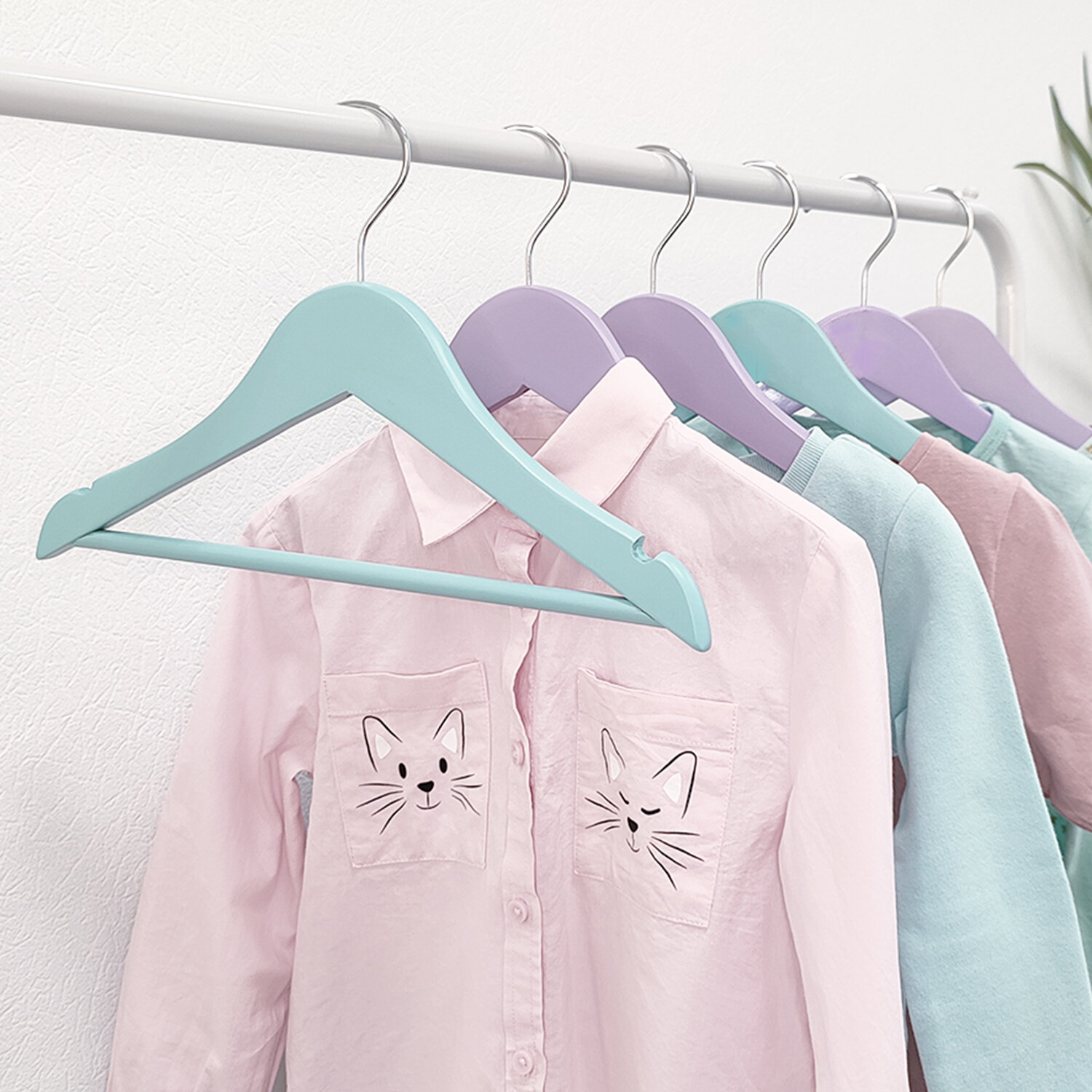 Купить Набор вешалок детских цветных деревянных, 6 шт., с перекладиной, с выемками, 30*19*1.2 см, сиреневый/бирюзовый