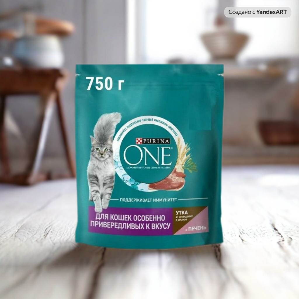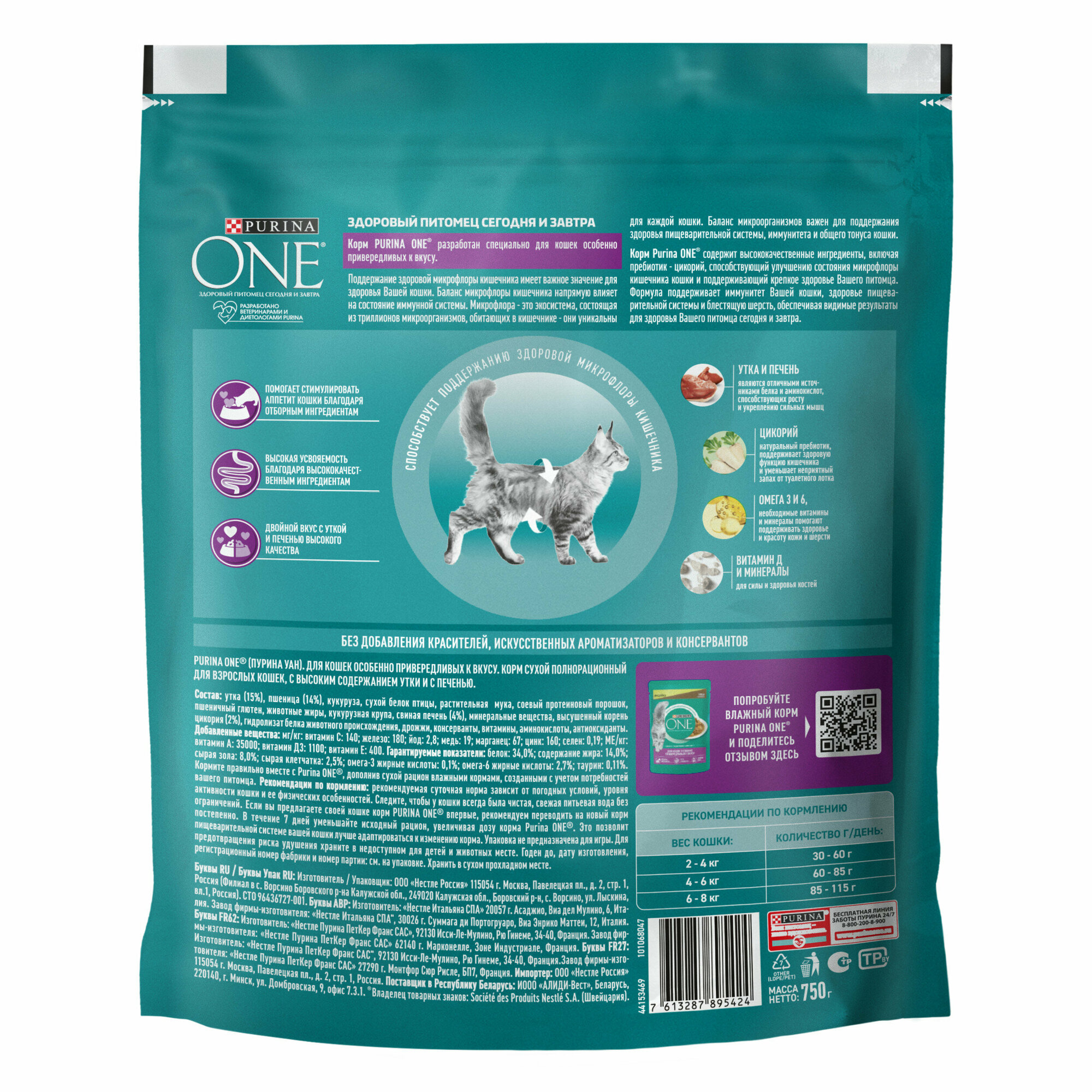 Корм сухой для кошек Purina ONE для особенно привередливых к вкусу, с уткой и печенью, 750 г