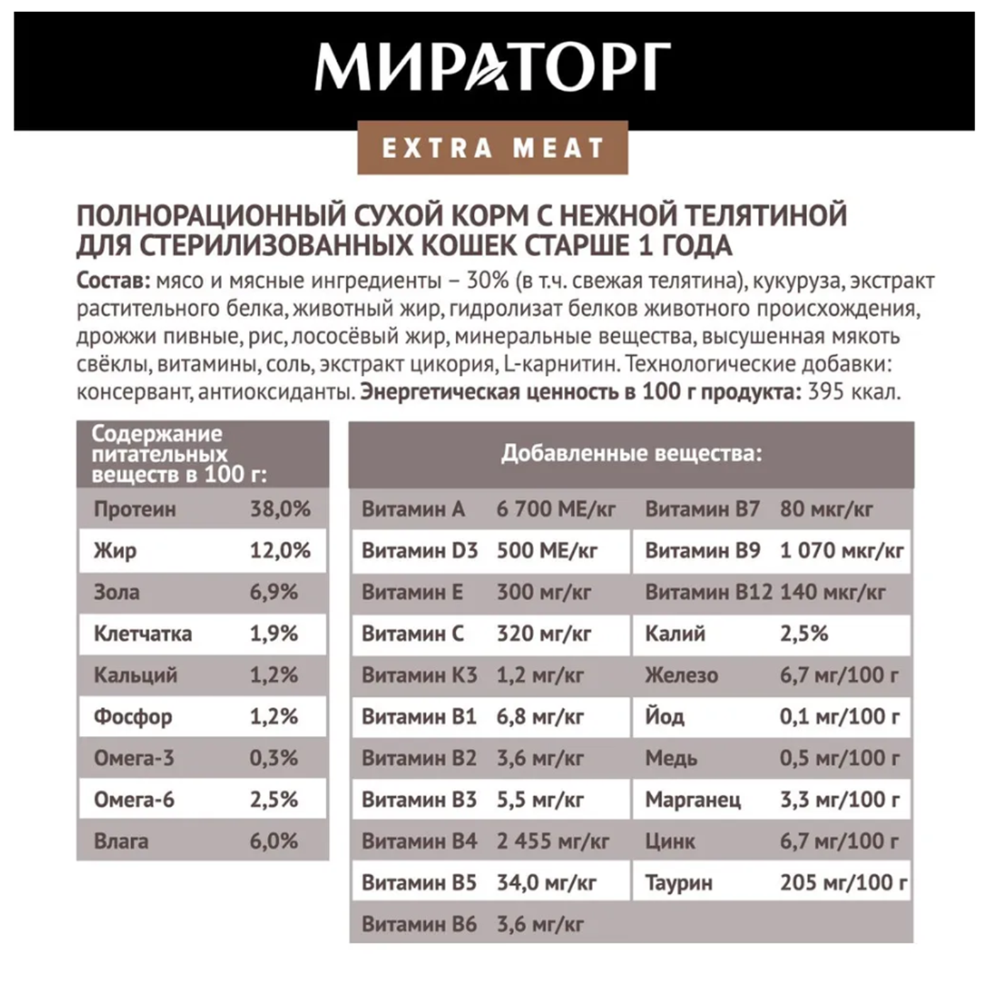 Сухой корм Мираторг Extra Meat для стерилизованных кошек, c телятиной, 2,6 кг