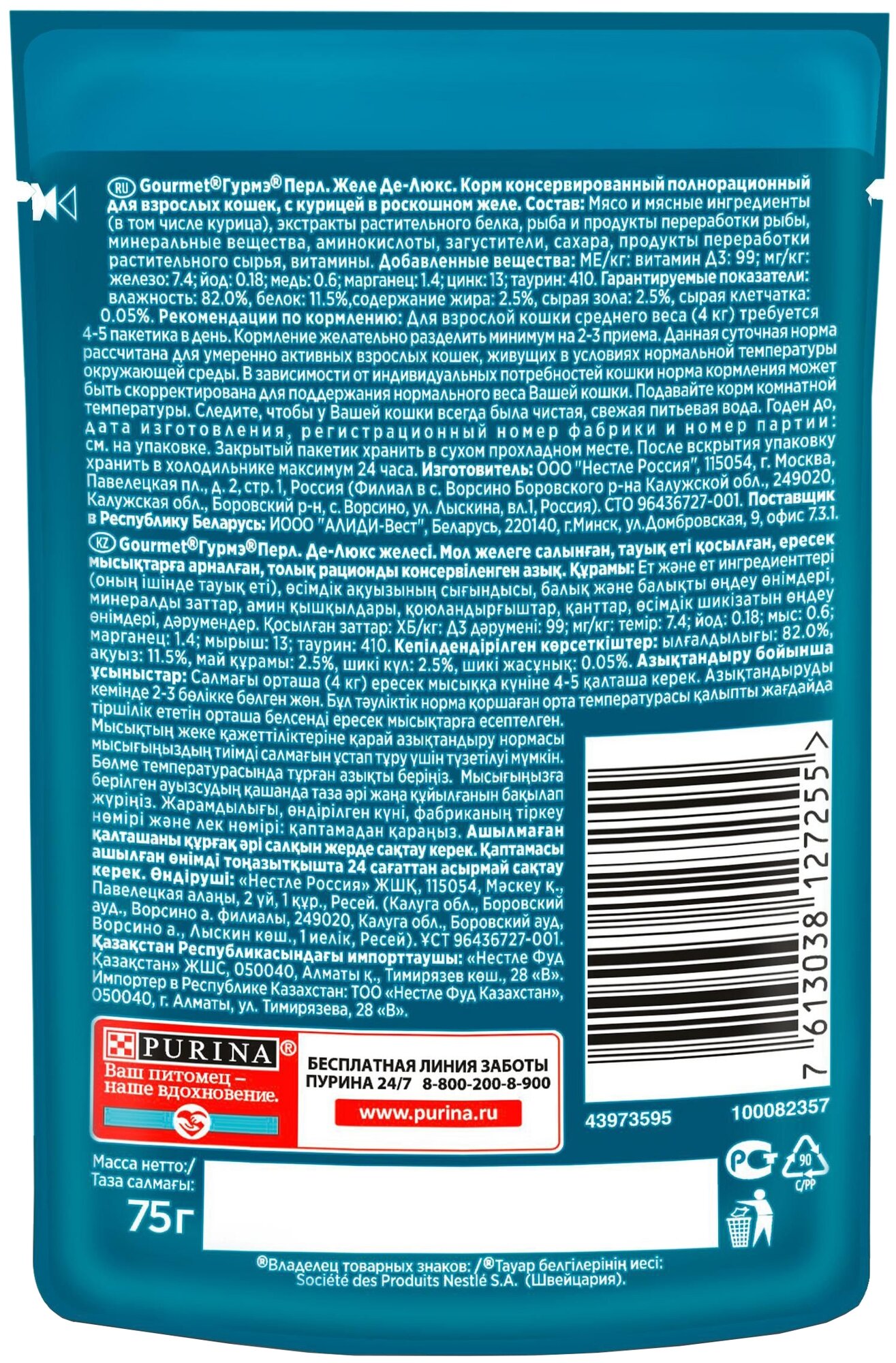 | Дозировка | для взрослой кошки среднего веса (4 кг) требуется 4-5 пакетиков в день, кормление желательно разделить минимум на 2-3 приема |