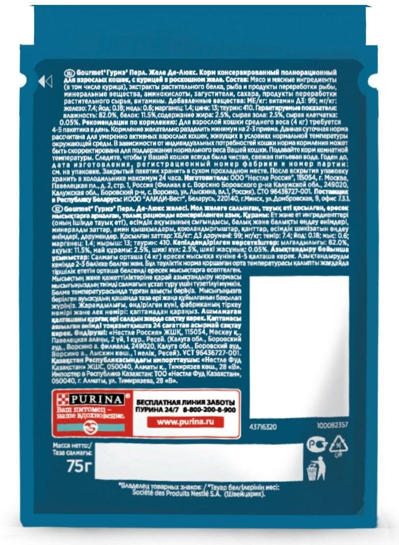Купить Влажный корм гурмэ для кошек курица перл желе де-люкс 75г
