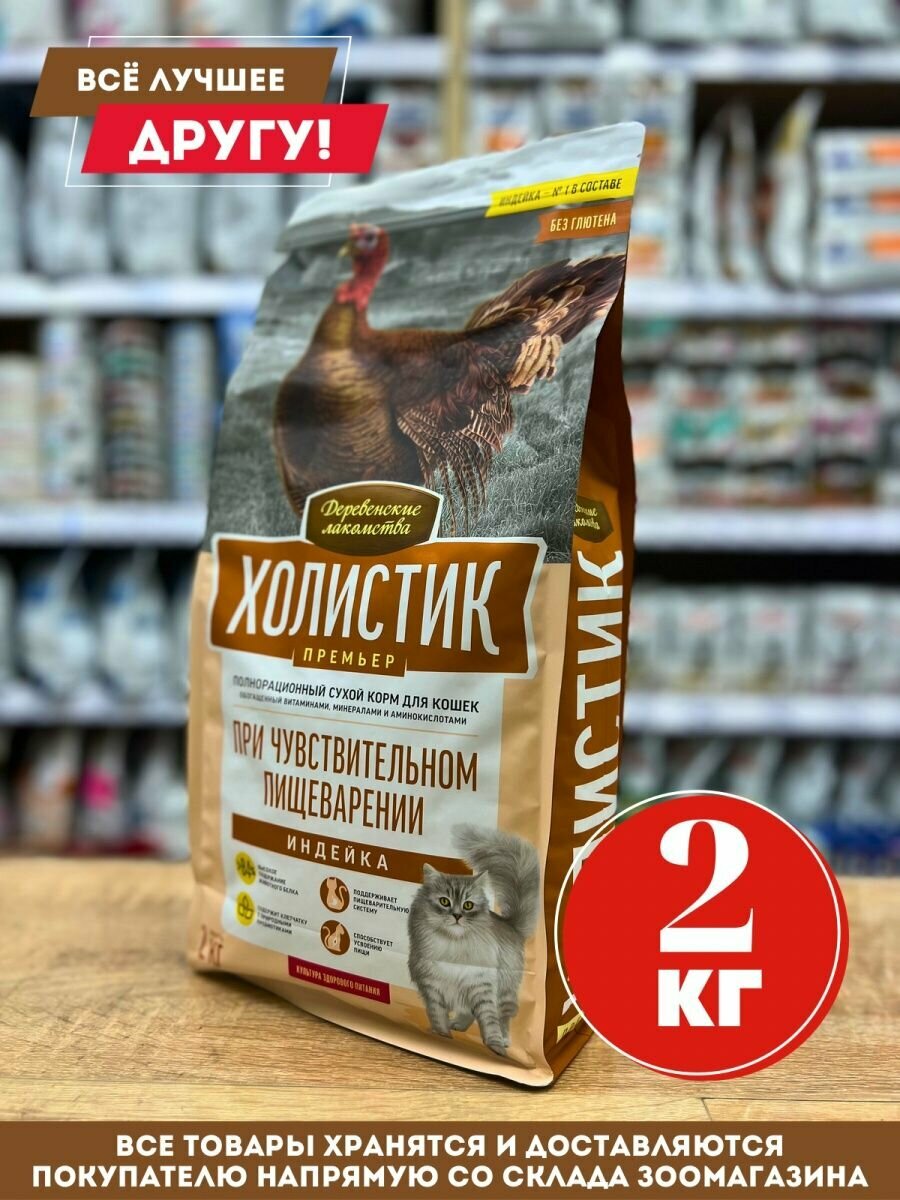 Деревенские лакомства Холистик Премьер сухой корм для кошек c чувствительным пищеварением, с индейкой, 2 кг