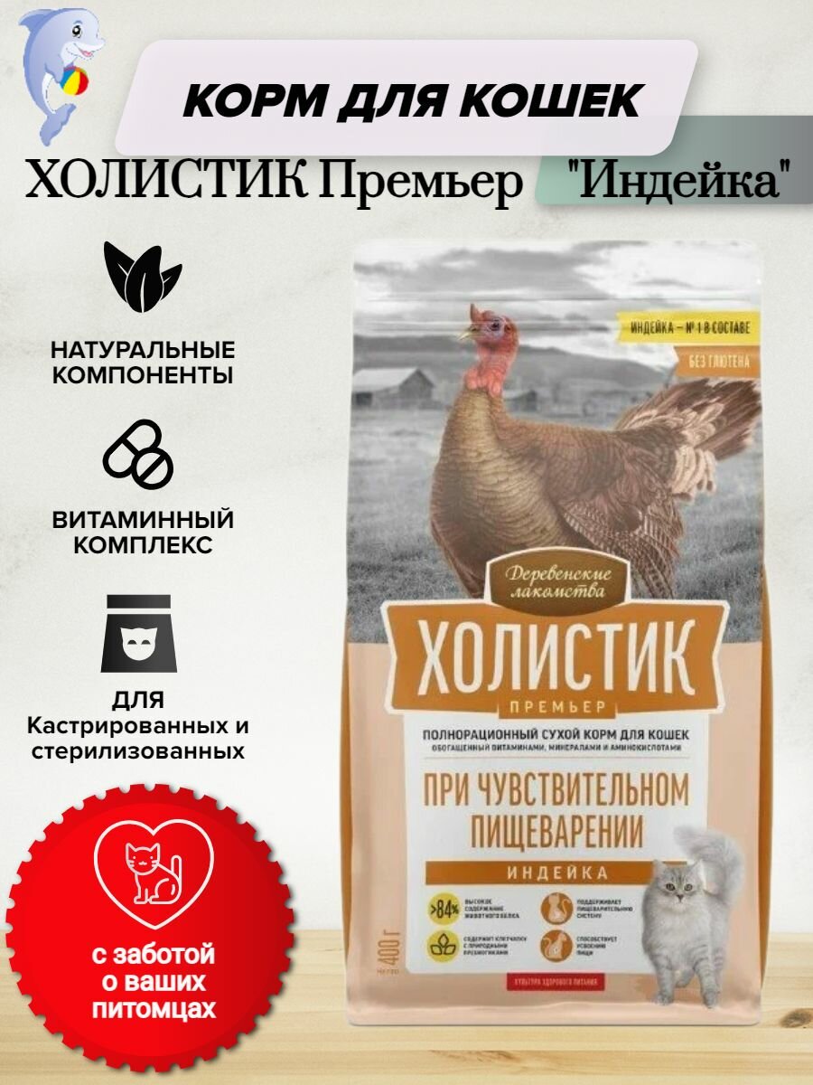 Деревенские лакомства Холистик Премьер Корм сух.индейка д/кошек с чувствительным пищевар.400г