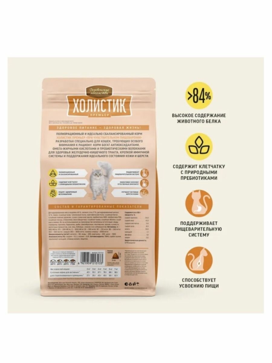 Деревенские лакомства Холистик Премьер сухой корм для кошек c чувствительным пищеварением, с индейкой, 2 кг