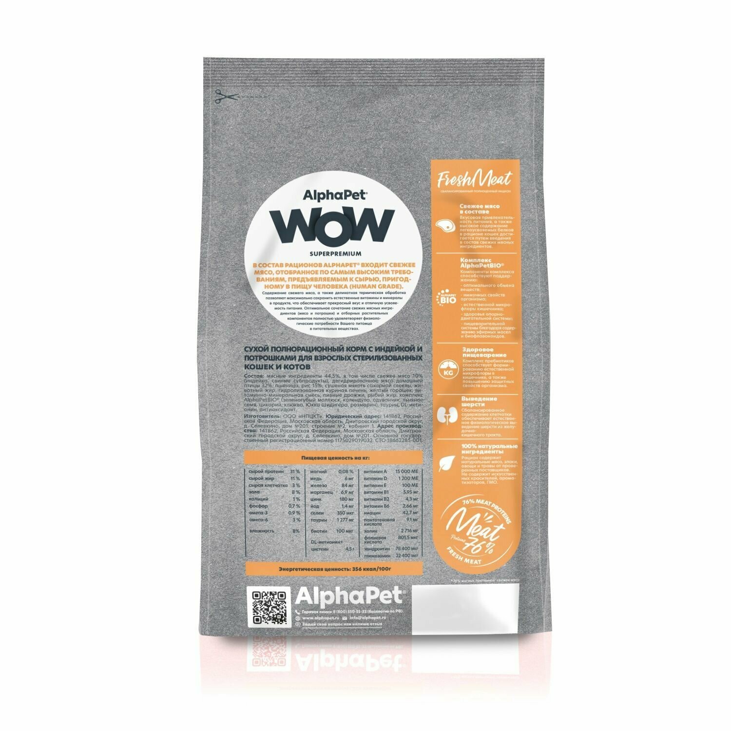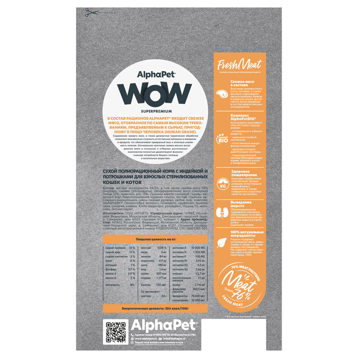 ALPHAPET WOW SUPERPREMIUM 350 гр сухой корм для взрослых стерилизованных кошек и котов с индейкой и , шт (10 шт)