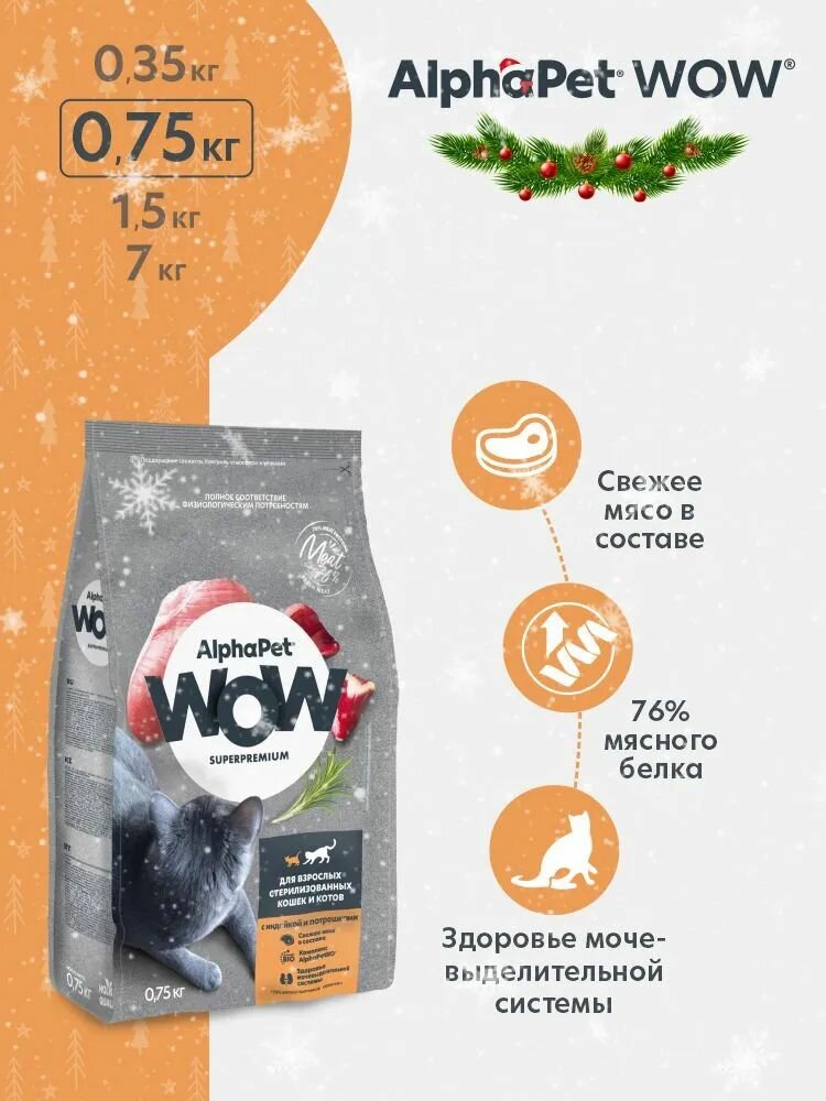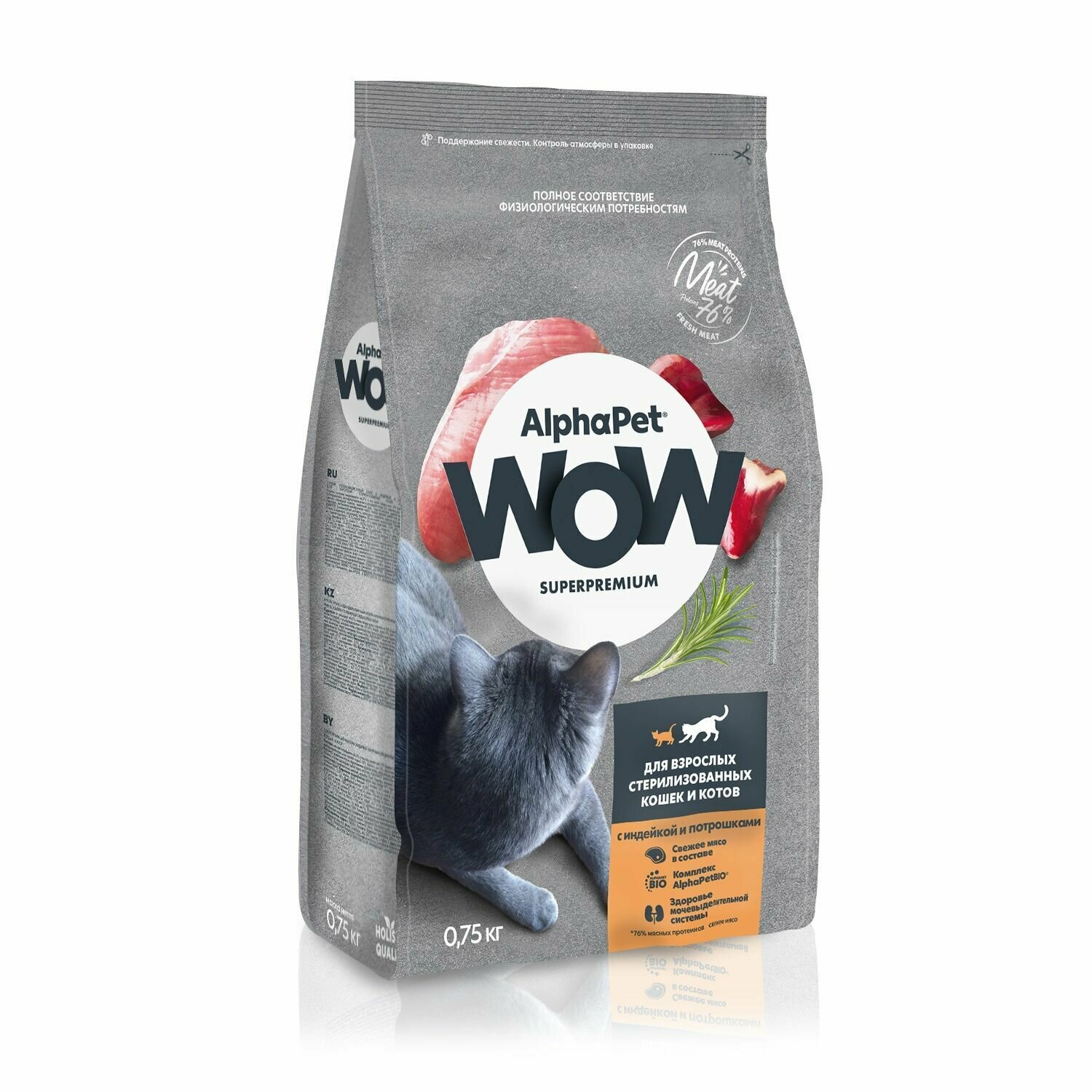 ALPHAPET WOW SUPERPREMIUM 750 гр сухой корм для взрослых стерилизованных кошек и котов с индейкой и , шт (2 шт)