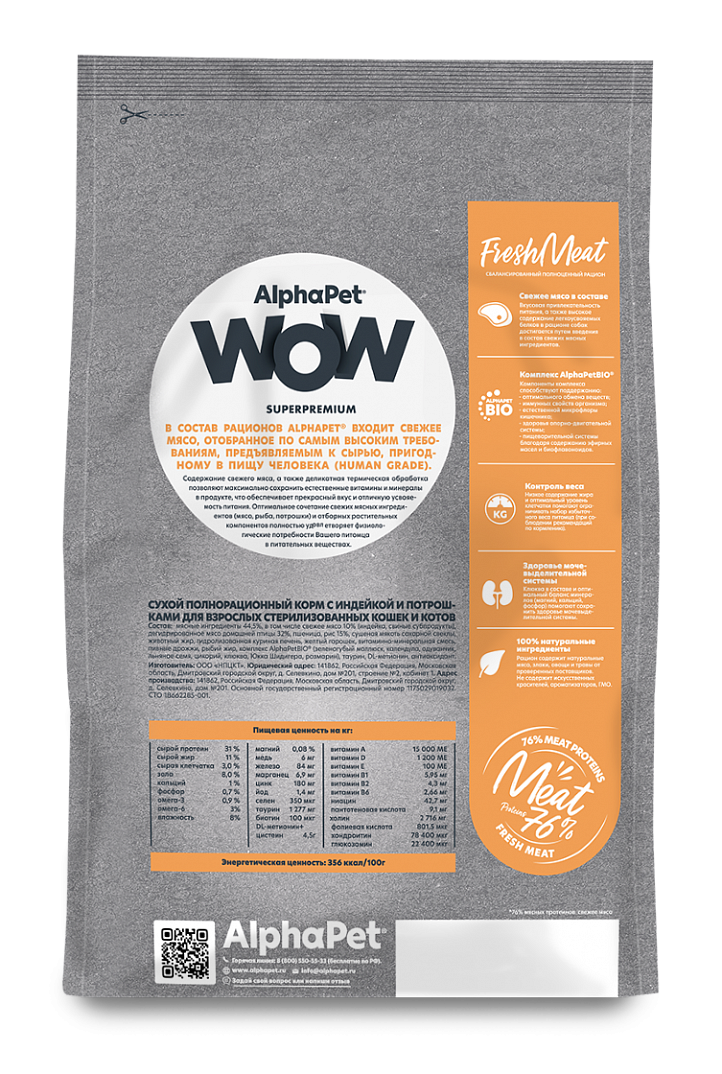 Корм AlphaPet WOW Superpremium для стерилизованных кошек и котов, c индейкой и потрошками, 1.5 кг
