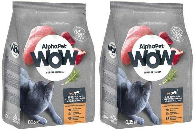 Купить Alphapet wow Superpemium сухой корм для взрослых стерилизованных кошек и котов с индейкой и потрошками, 350 гр, 2 уп