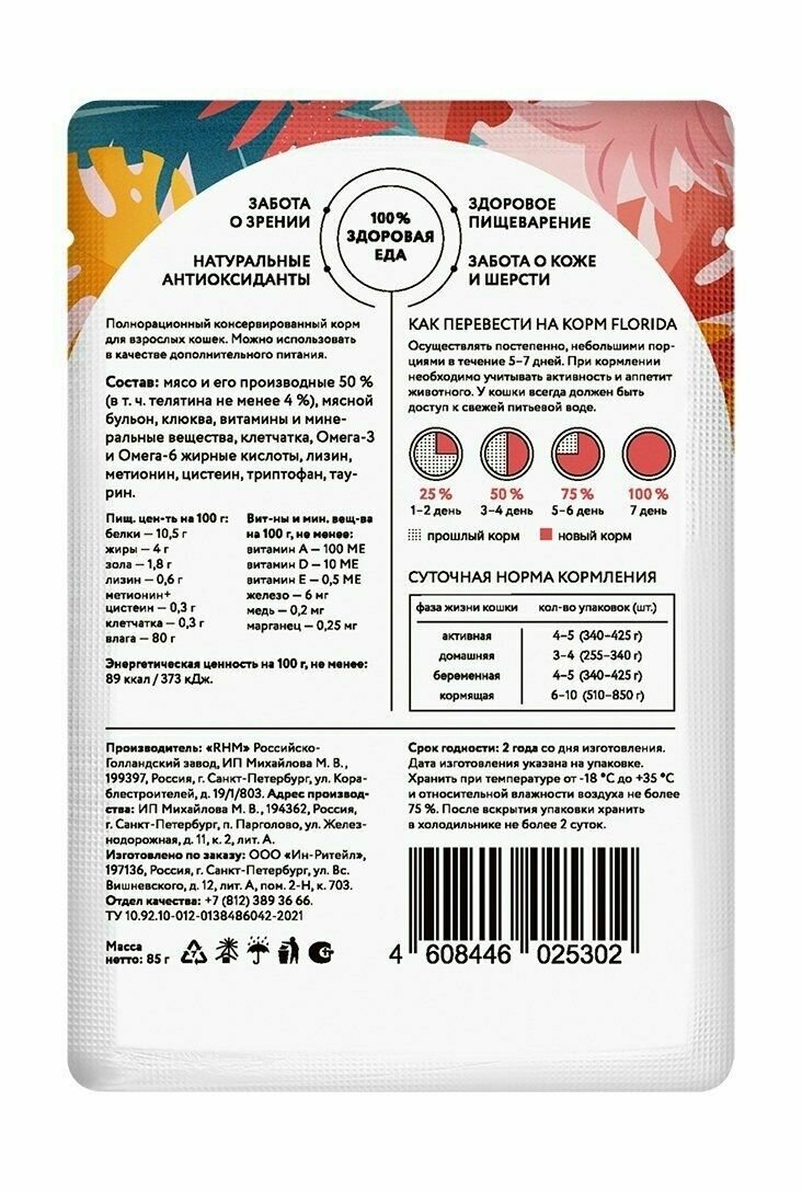 СохранитьFLORIDA паучи влажный корм для взрослых кошек: кусочки с телятиной и клюквой в соусе 12шт*85г интересное: