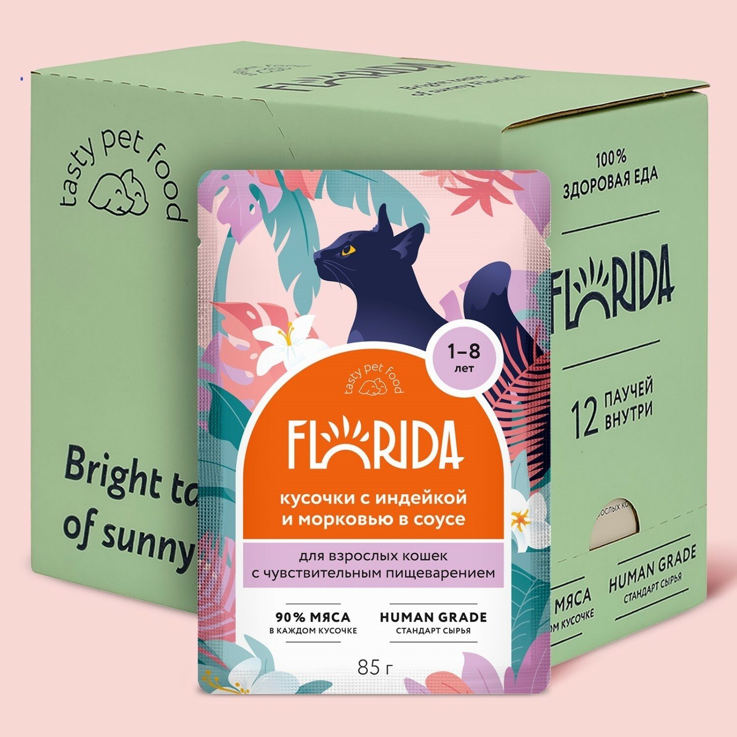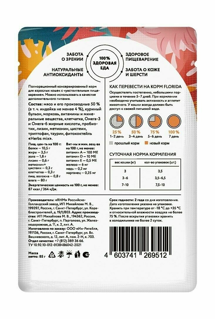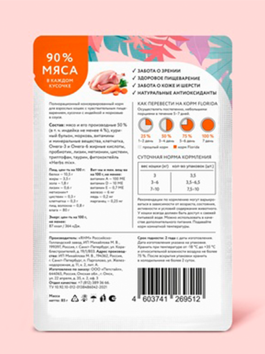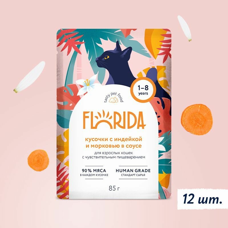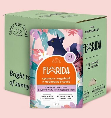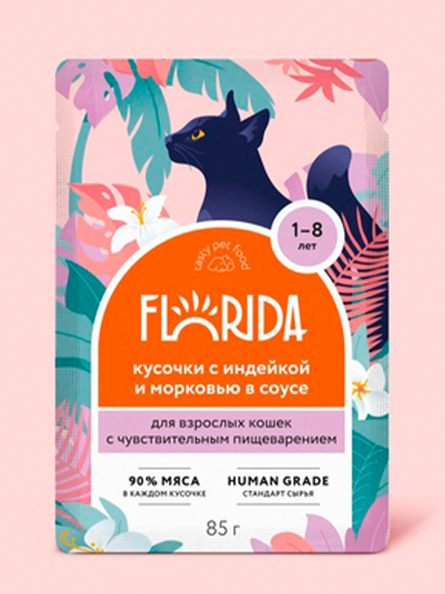 FLORIDA паучи для взрослых кошек с чувствительным пищеварением: кусочки с индейкой и морковью в соусе 0,085 кг. х 6 шт.