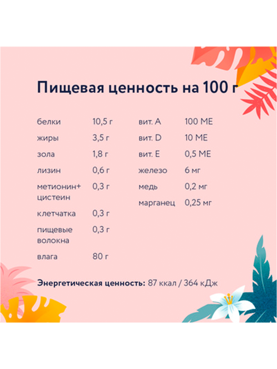 | Пищевая ценность | белки 34%, жир 16%, клетчатка 3%, зола 7%, влажность 7%, кальций 1,1%, фосфор 0,9% |