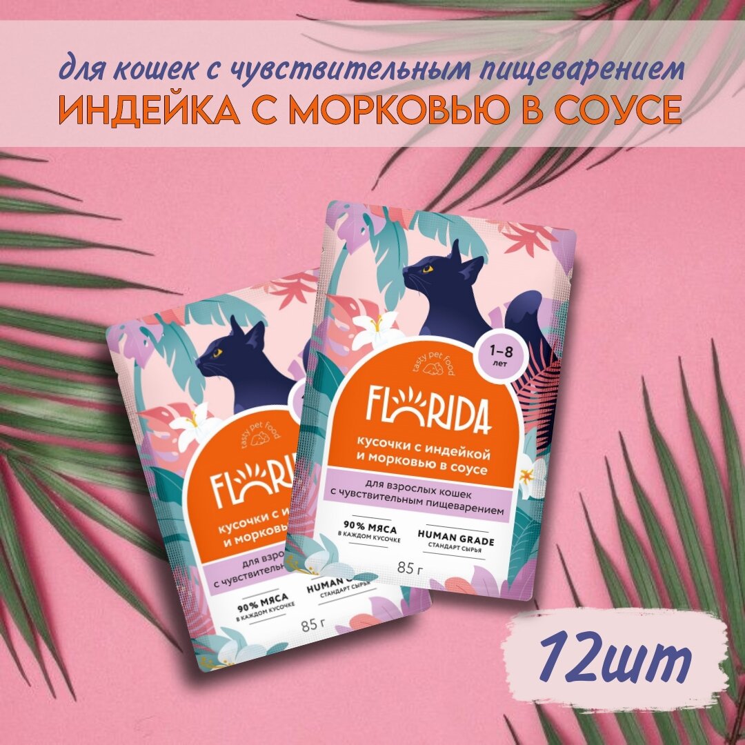 FLORIDA для взрослых кошек с чувствительным пищеварением с индейкой и морковью в соусе (85 гр х 12 шт)