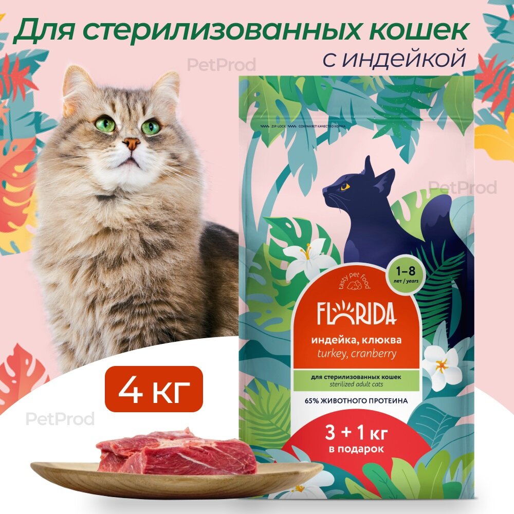 FLORIDA Сухой корм для взрослых стерилизованных кошек с индейкой и клюквой 3+1кг, 4кг
