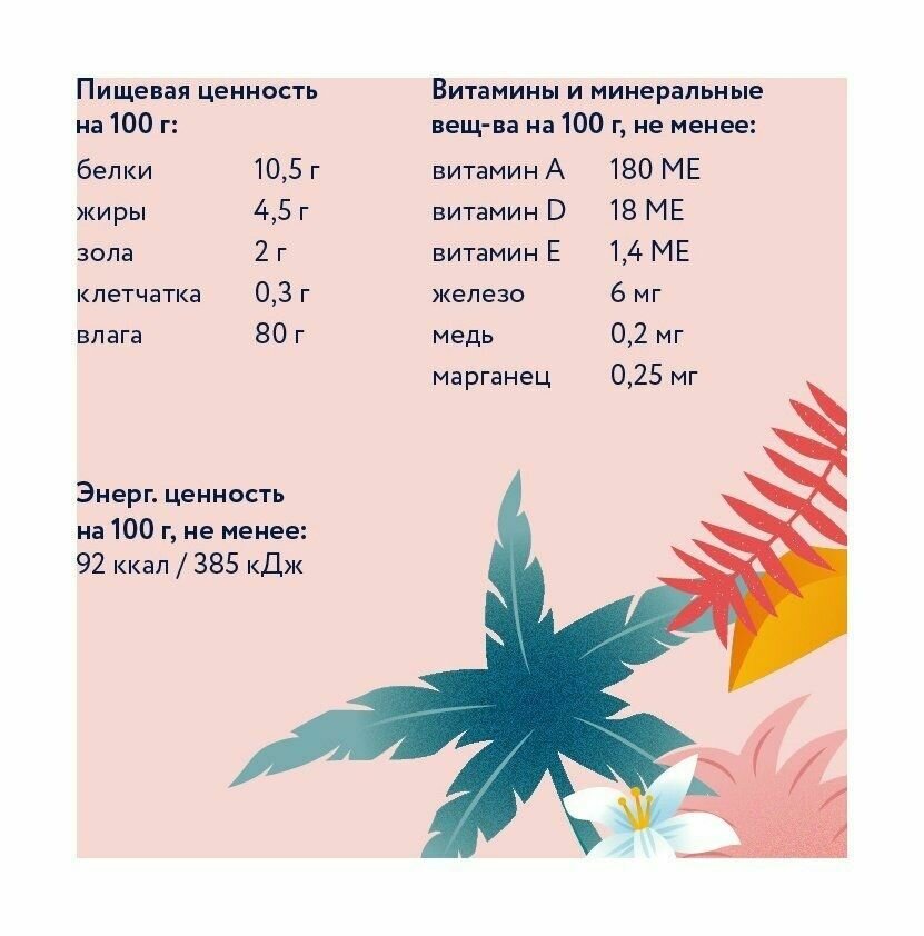 | Витамины | витамин А 24000 МЕ/кг, витамин Д 900 МЕ/кг, витамин Е 300 мг/кг |