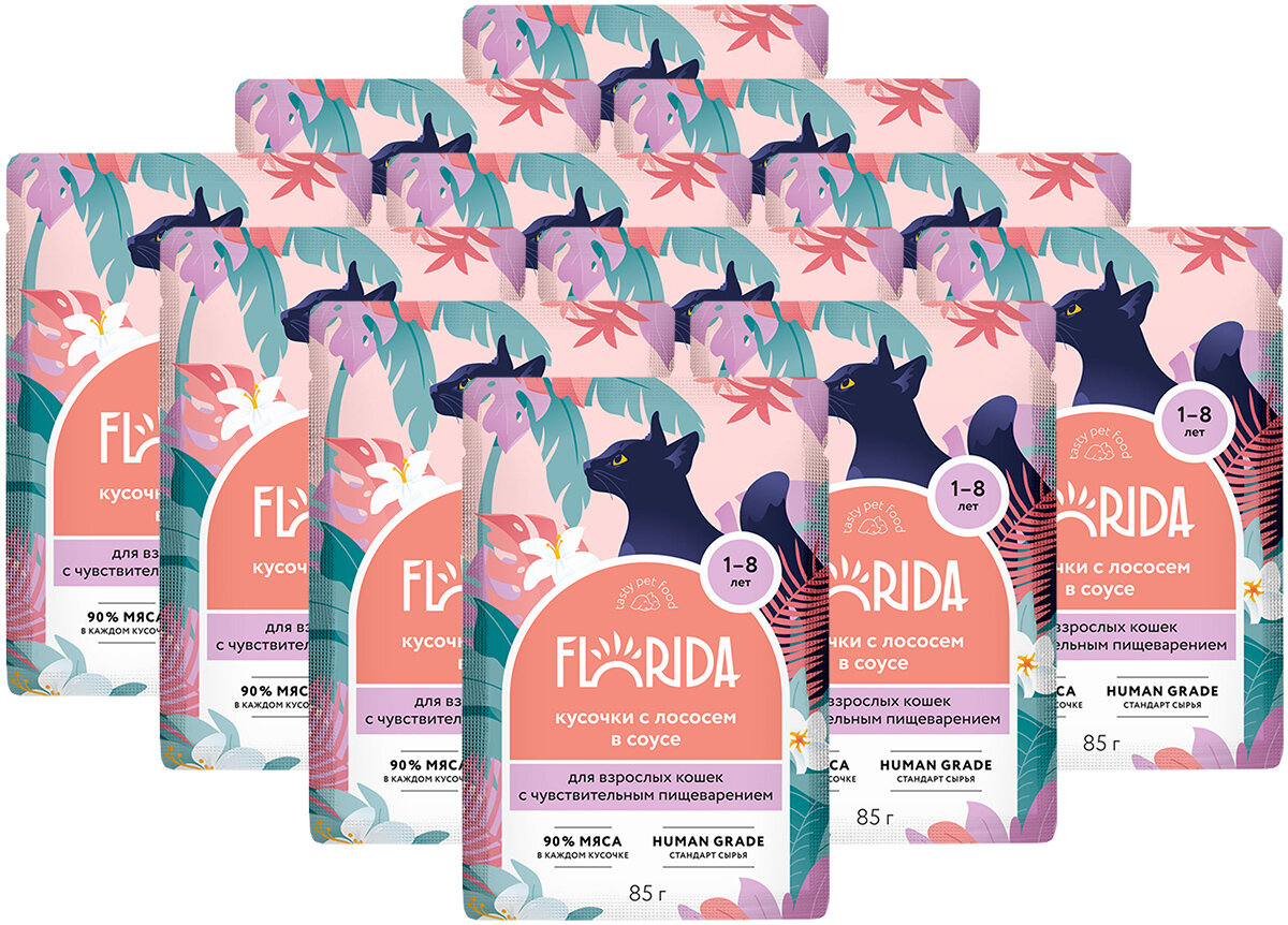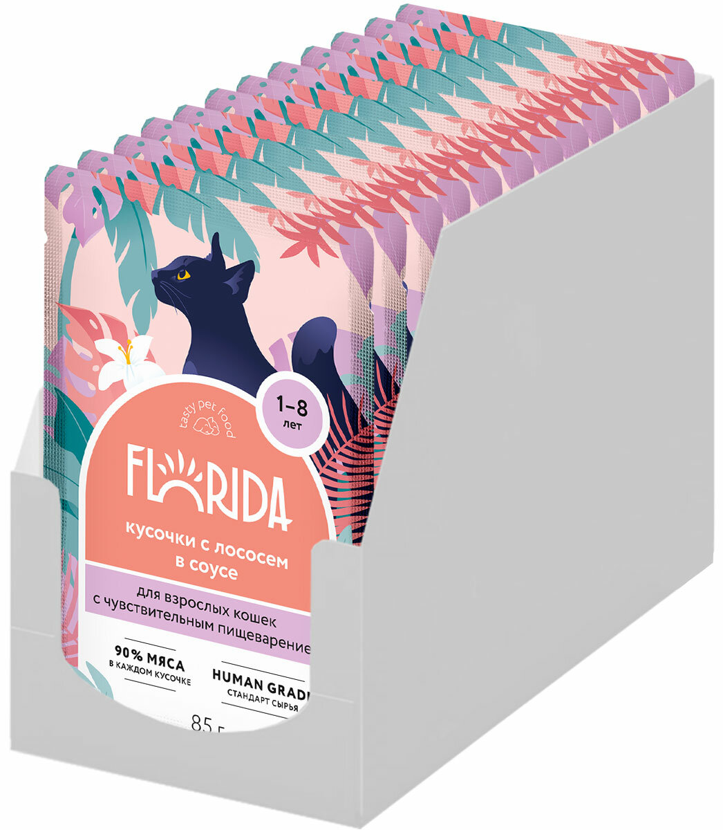 Купить FLORIDA для взрослых кошек с чувствительным пищеварением с лососем в соусе (85 гр х 12 шт)