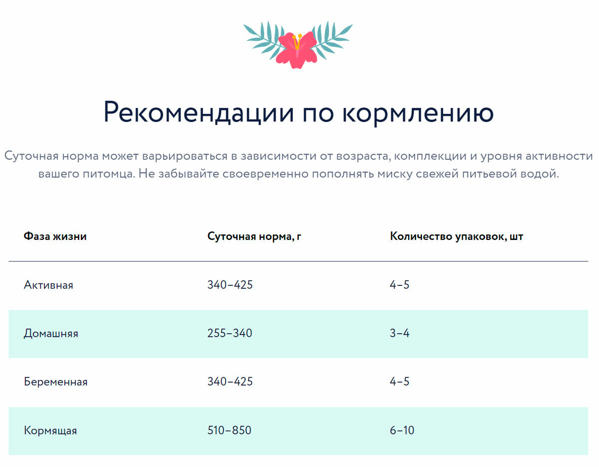 | Дополнительная информация | Переход с предыдущего рациона осуществлять постепенно, небольшими порциями в течение 5-7 дней. При кормлении необходимо учитывать активность и аппетит животного. Корм должен быть комнатной температуры. Содержимое открытой упаковки хранить при температуре +5°С и использовать в течение 2 дней. У кошки всегда должен быть доступ к свежей питьевой воде. |