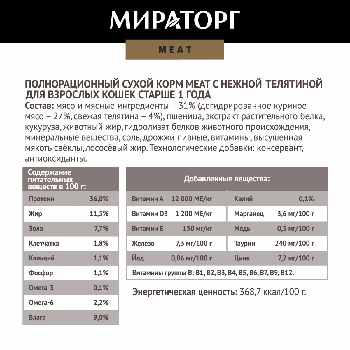 | Пищевая ценность | влага — макс.10,0% протеин — мин. 32,0% жир — мин. 10,0% зола — макс. 9,2% клетчатка — макс. 2,0% кальций — мин. 1,0% фосфор — мин. 0,9% |