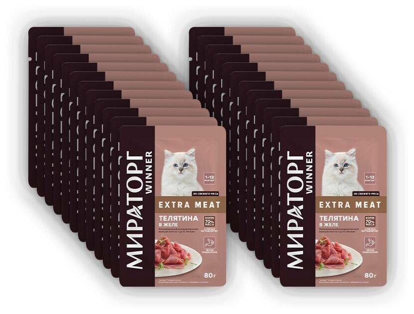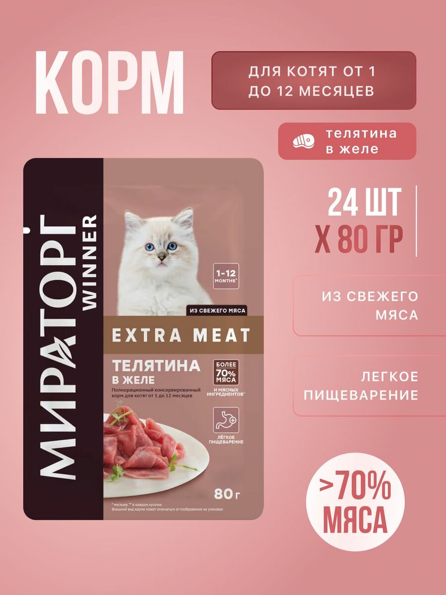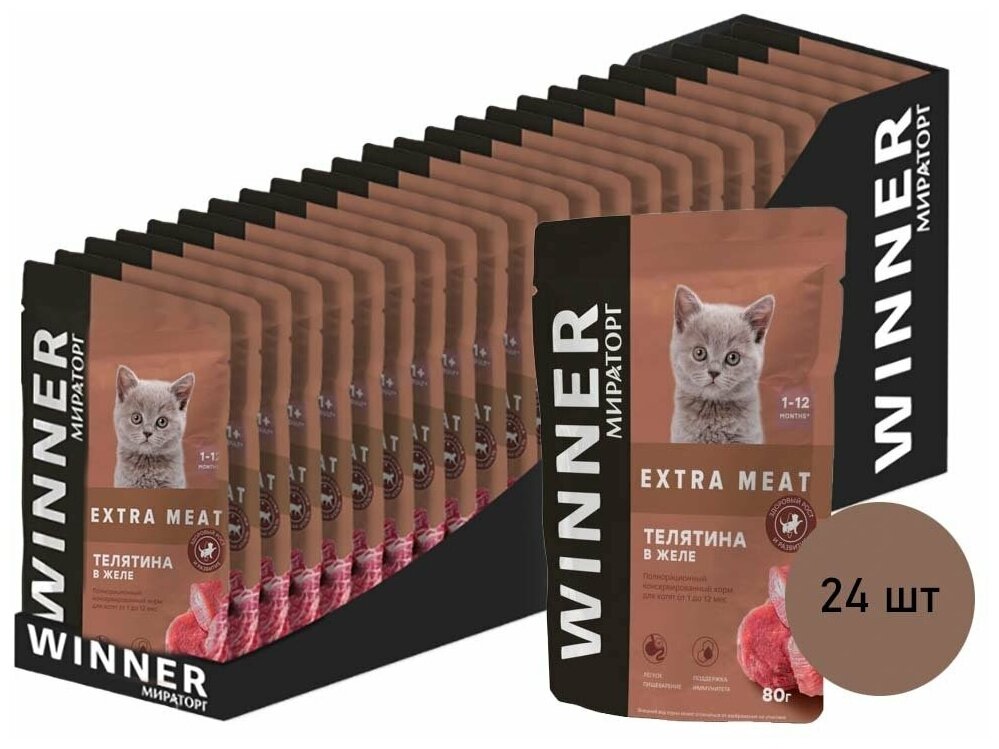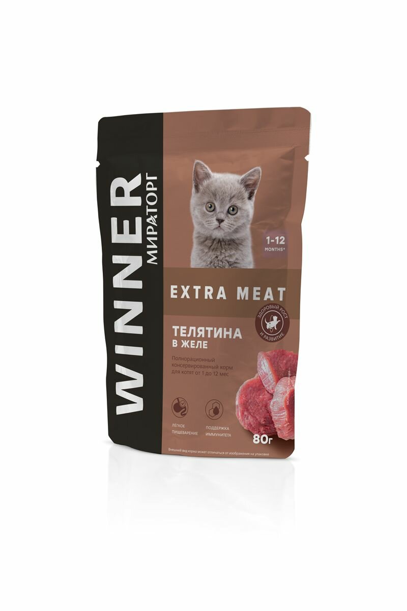 Купить Корм конс. полнорационный Winner Extra Meat с телятиной в желе для котят от 1 до 12 мес "Телятина в желе" 0,08 кг*24 (1,92 кг)
