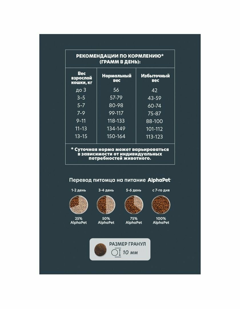 | Дополнительная информация | 76% мясного белка • Свежее мясо в составе • Баланс магния, кальций и фосфора для здоровья мочевыделительной системы • Уникальный комплекс натуральных добавок AlphaPetBIO® • Натуральные ингредиенты • Не содержит ГМО, искусственных красителей и ароматизаторов • Качество сырья выше уровня Human Grade • Бережная технология, сохраняющая вкусовые и питательные свойства свежего мяса |