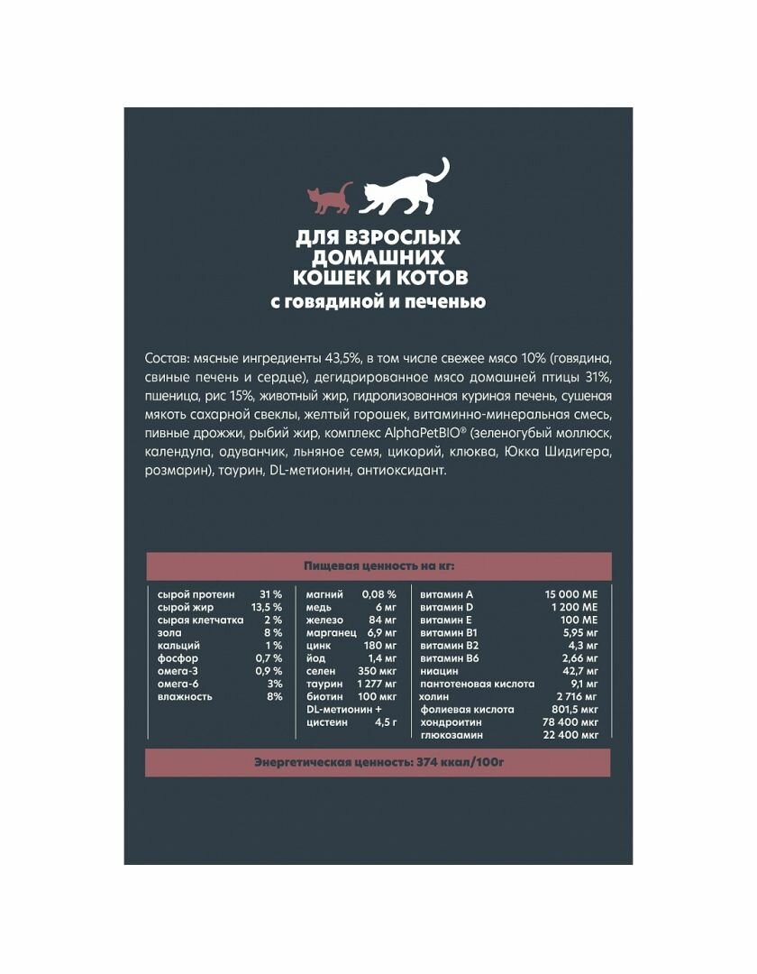 Купить Сухой корм для кошек полнорационный AlphaPet WOW Superpremium c говядиной и печенью, 1,5кг (АльфаПет)