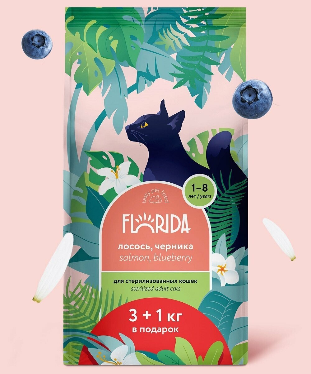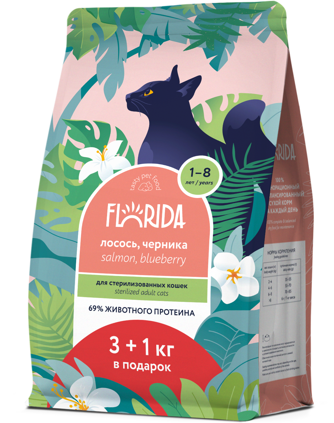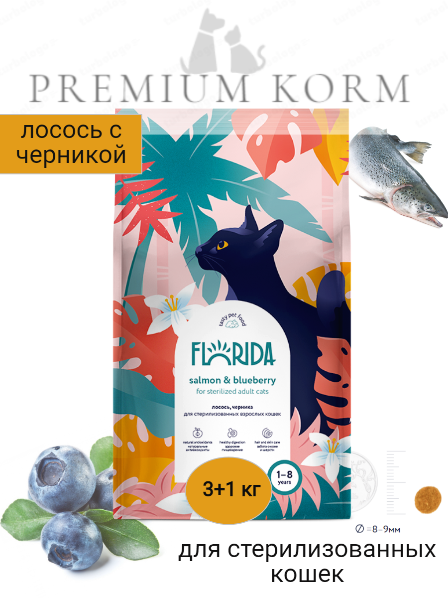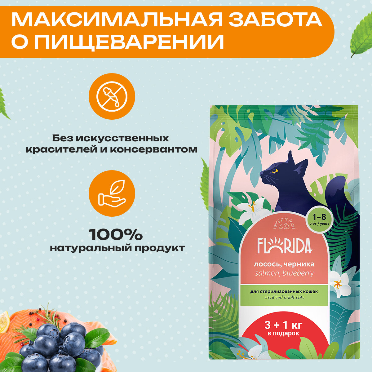 Купить FLORIDA сухой корм для взрослых стерилизованных кошек и котов с лососем и черникой, 3 кг + 1 кг в подарок