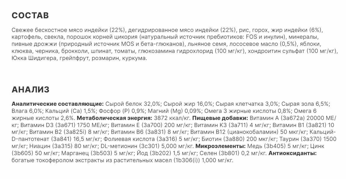 | Пищевая ценность | сырой белок 36,0%, сырой жир 11,0%, сырая клетчатка 3,0%, влага 6,0%, кальций (са) 1,4%, фосфор (p) 1,0%, магний (mg) 0,08%, натрий (na) 0,5%, омега 3 жирные кислоты 0,5%, омега 6 жирные кислоты 1,6% |