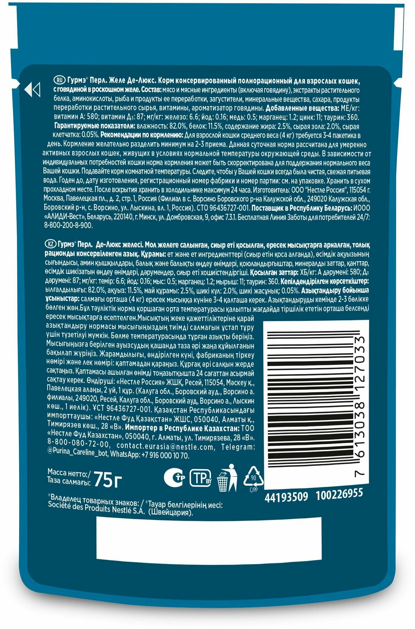 Влажный корм гурмэ для кошек говядина перл желе де-люкс 75г