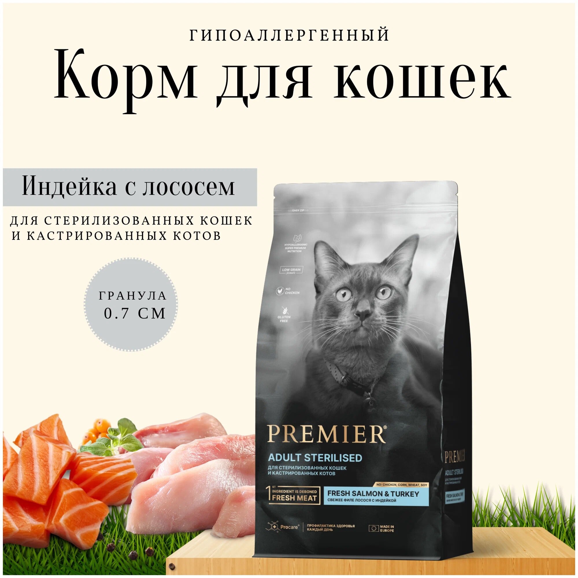 Premier Cat Sterilised сухой корм Премьер для взрослых стерилизованных кошек, свежее филе лосося с индейкой - 2 кг