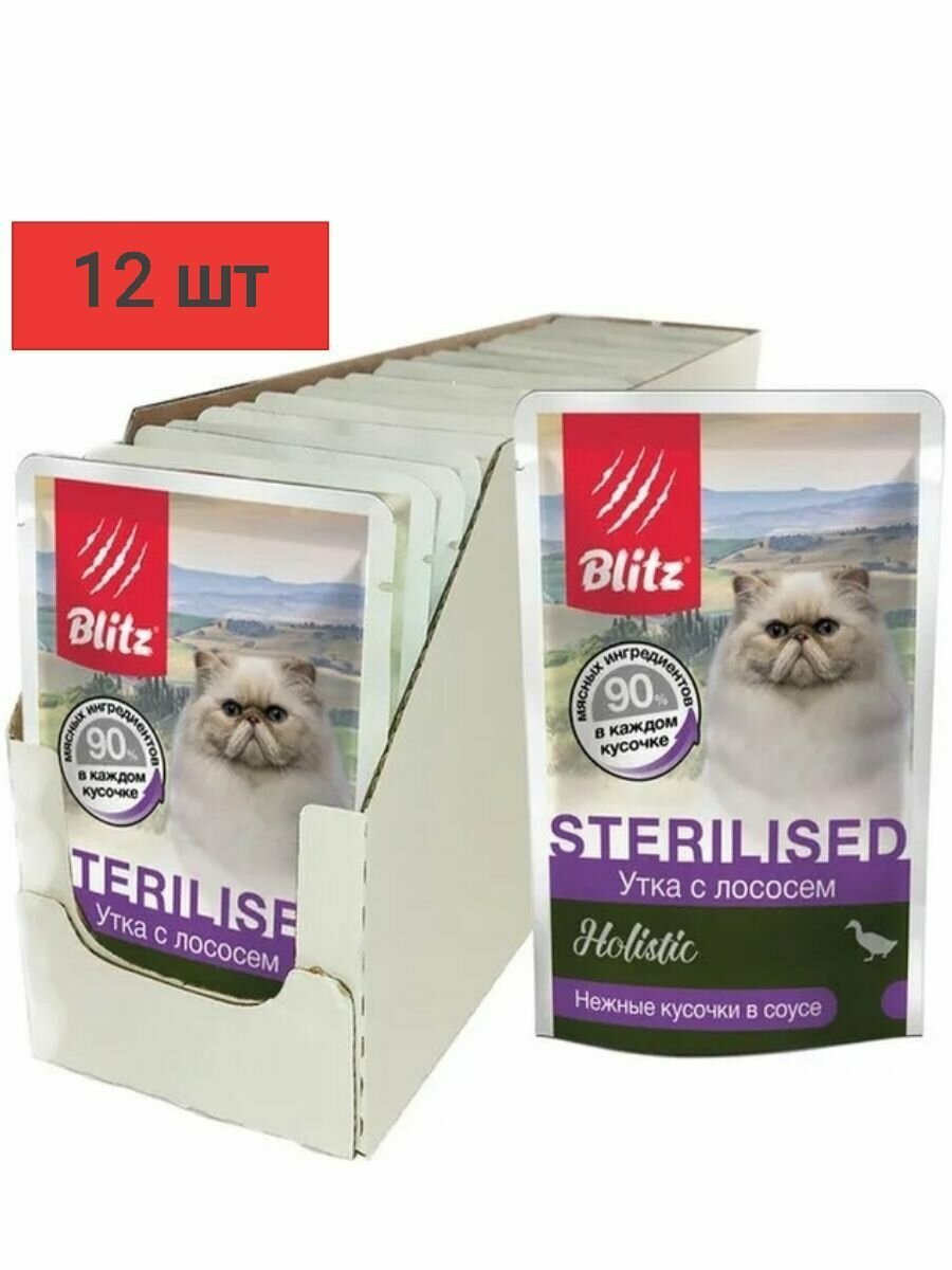Купить Корм влажный Blitz Holistic Sterilised Cat для стерилизованных кошек (утка с лососем) полнорационный, 12 шт