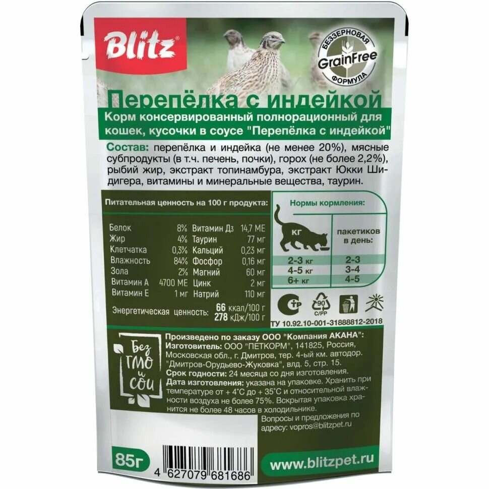 Купить Blitz Holistic Пауч для кошек Перепелка с Индейкой в соусе 85гр 85 гр x 12 шт.