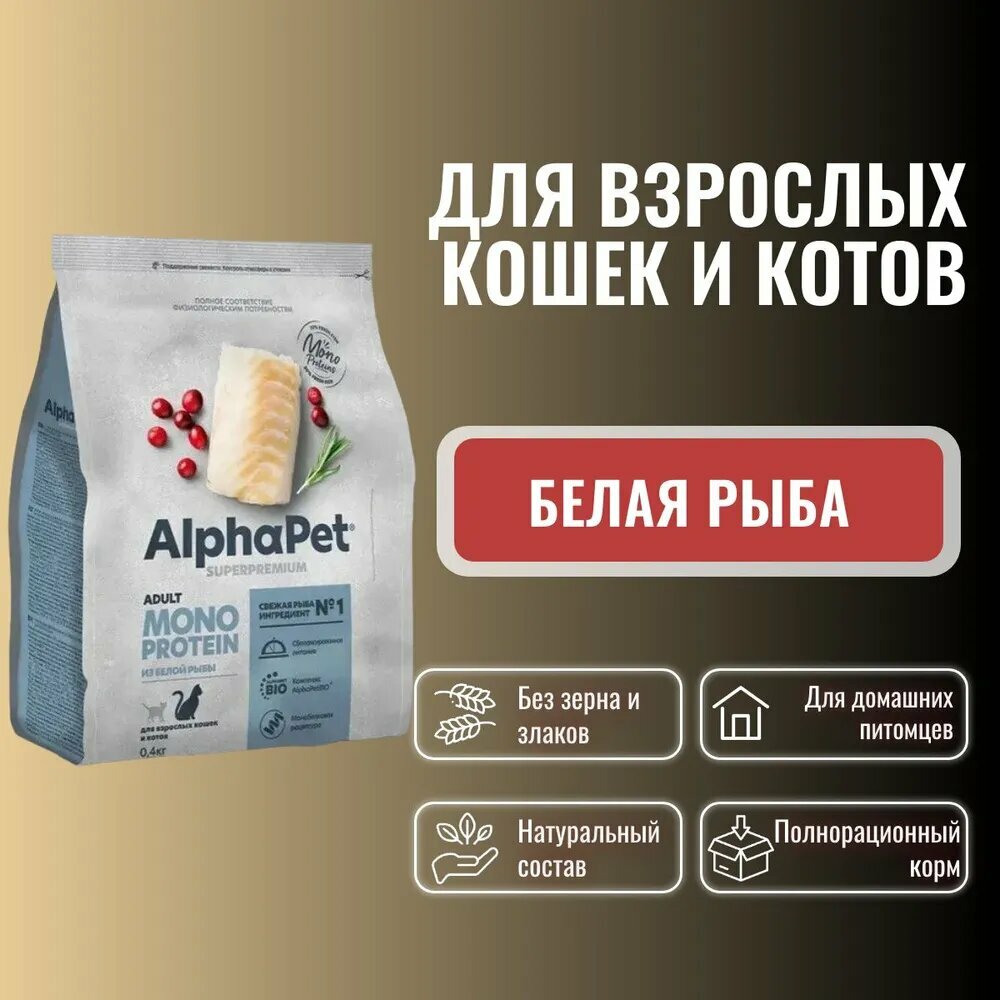 AlphaPet Superpremium Сухой корм монобелковый для взрослых кошек, Белая рыба 400гр