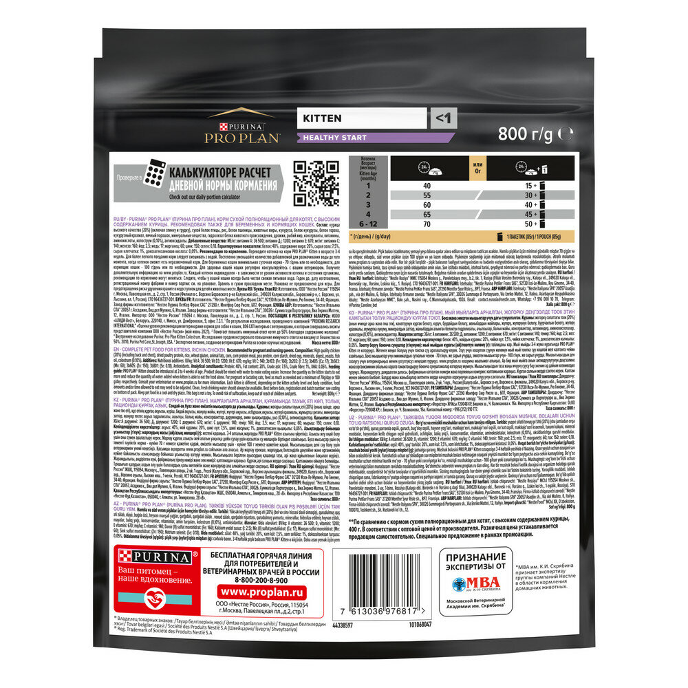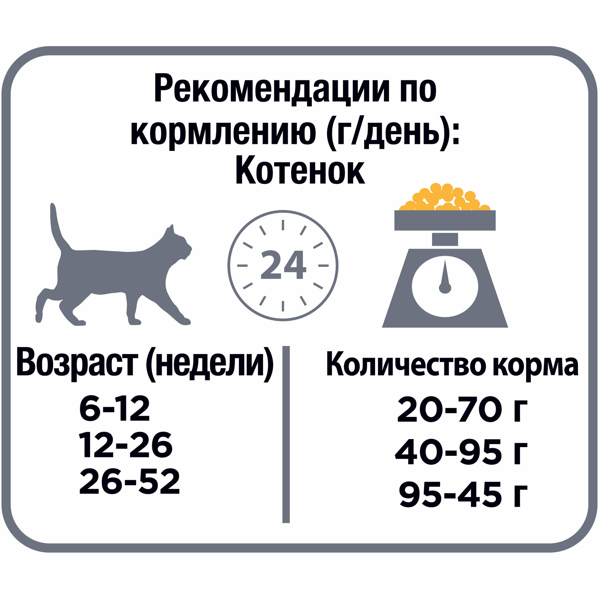 | Дозировка | см. таблицу. Переводите котенка на корм Pro Plan® JUNIOR в возрасте 3-4 недели. Для более легкого поедания корм следует смешивать с водой. Постепенно уменьшайте количество добавляемой для размачивания воды до того момента, когда котенок сможет есть не размоченный корм. Придерживайтесь 2-3 разового кормления или давайте корм по необходимости. Для беременных кошек минимальная суточная норма 90 г/день, для кормящих – минимальная суточная норма 180 г/день или по необходимости. Рекомендации по кормлению, позволяющие поддерживать идеальную форму, могут варьироваться в зависимости от возраста животного, его активности и условий окружающей среды |