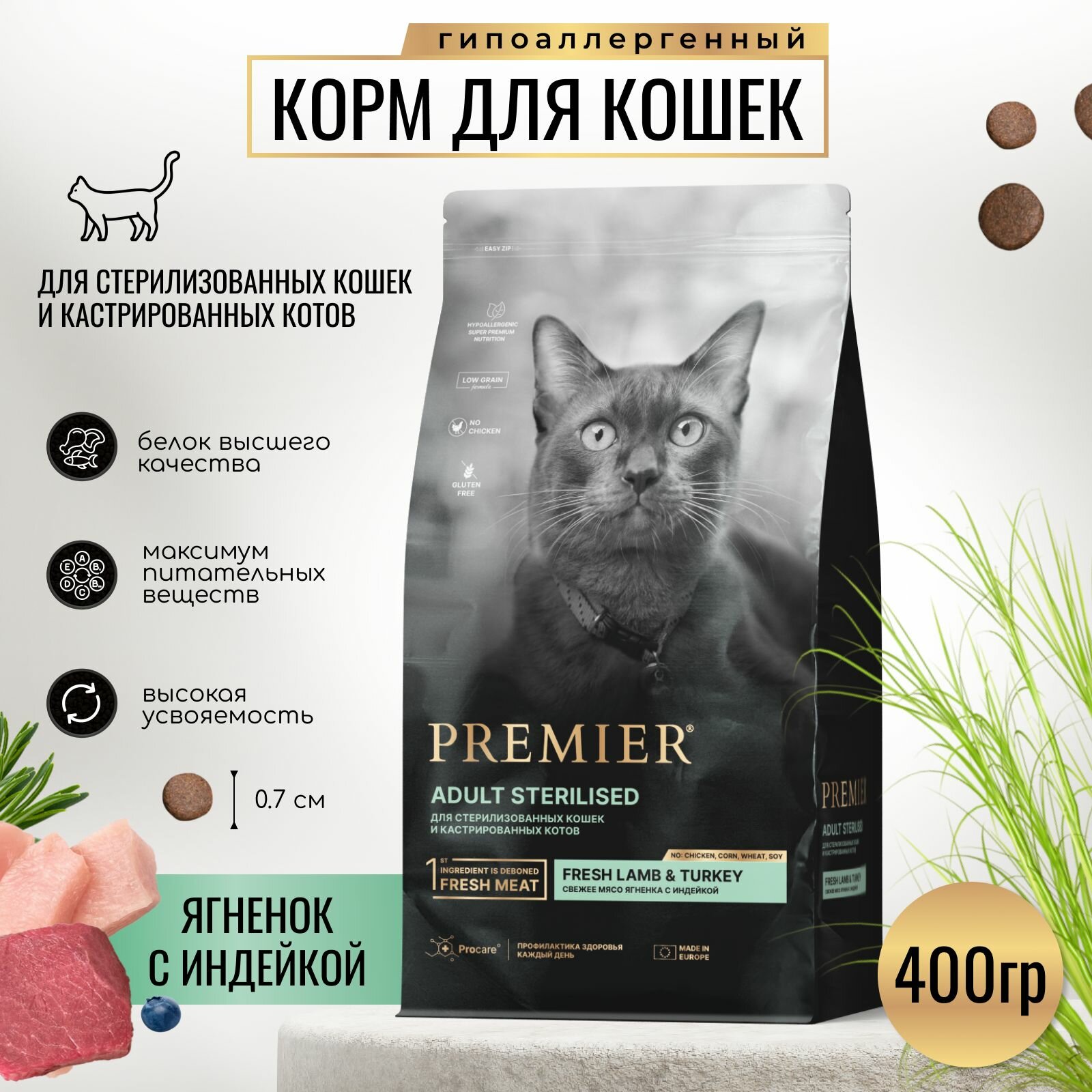 Купить Сухой корм для стерилизованных кошек и кастрированных котов Premier при чувствительном пищеварении, ягненок с индейкой 400 г
