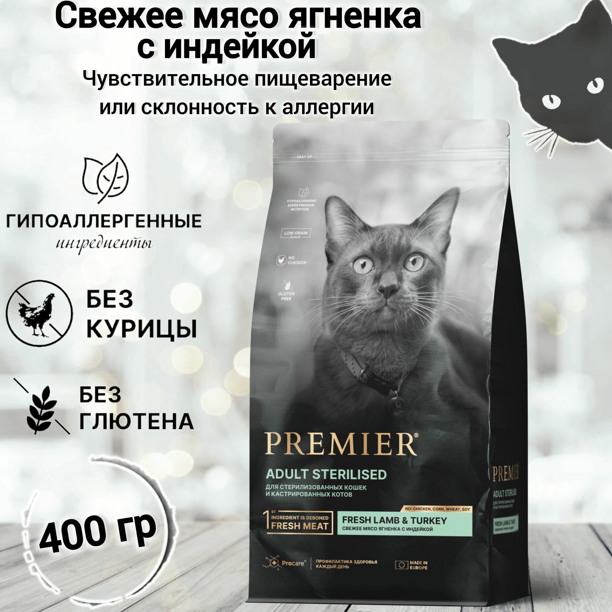 Сухой корм для кошек PREMIER Cat Lamb&Turkey STERILISED (Свежее мясо ягненка с индейкой для взрослых стерилизованных кошек и кастрированных котов от 1 года) 400 гр.