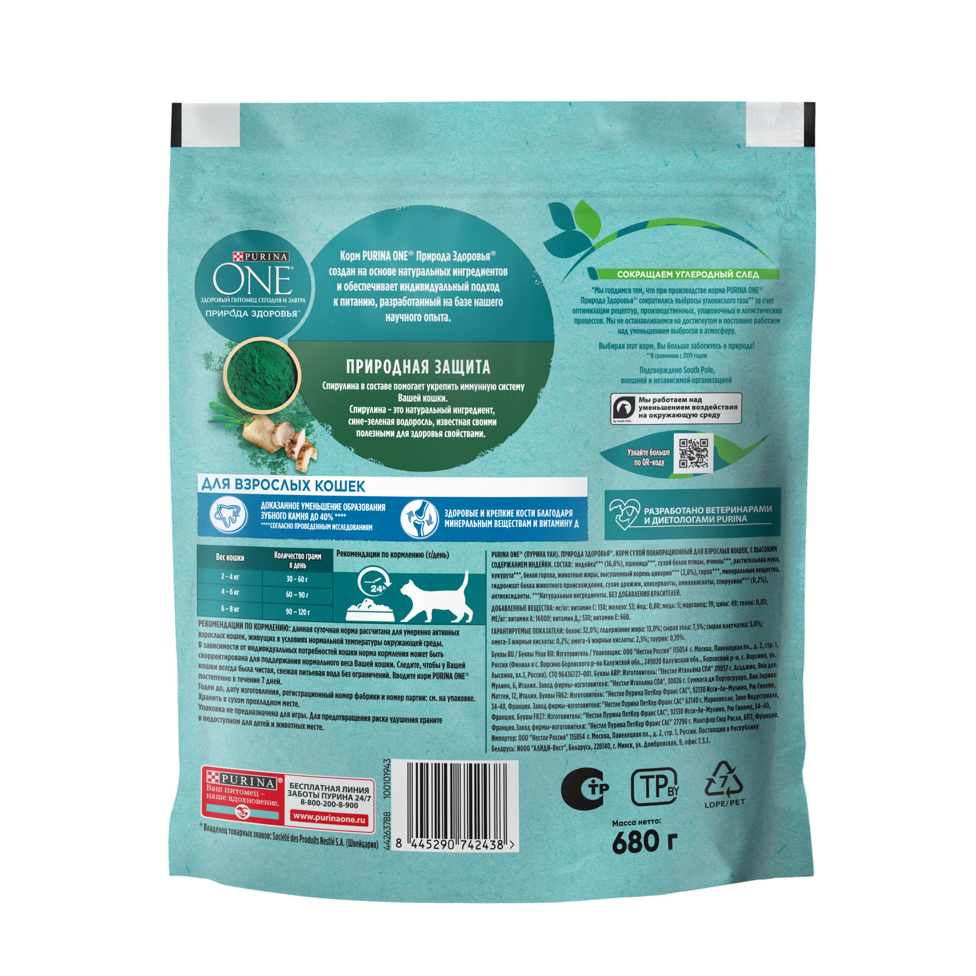 PURINA ONE Природа Здоровья 680 г сухой корм для взрослых кошек, с высоким содержанием индейки и спирулиной