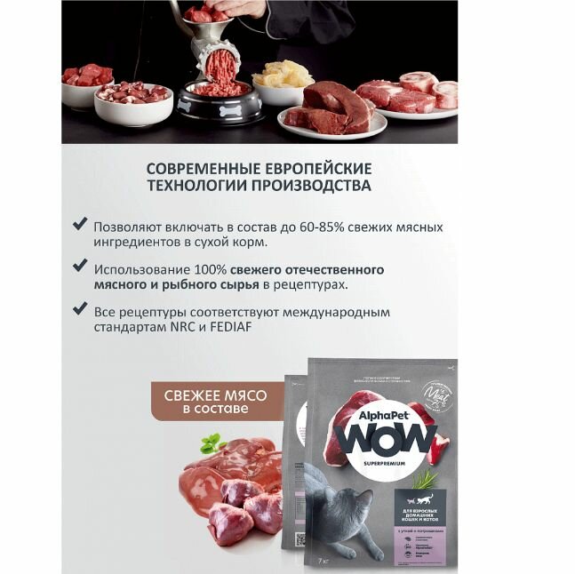 Купить Сухой корм для домашних кошек и котов AlphaPet WOW Superpremium с уткой и потрошками, 7 кг