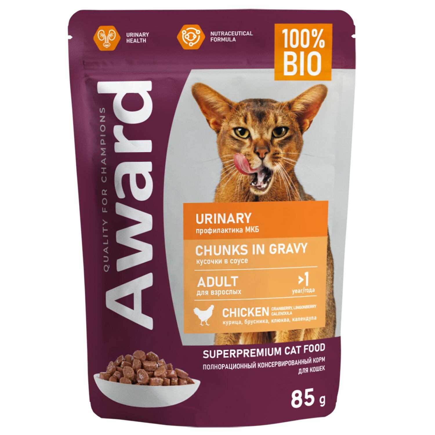 AWARD Urinary влажный корм для взрослых кошек, для профилактики мочекаменной болезни, кусочки в соусе с курицей, в паучах - 85 г х 24 шт