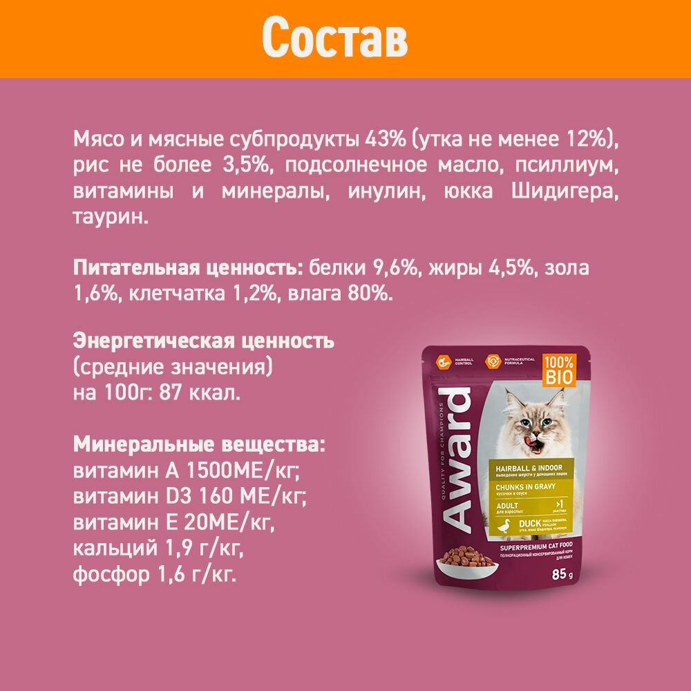 AWARD HAIRBALL & INDOOR DUCK для взр кош живущих дома для вывода шерсти с уткой в соусе пауч 85гр 85 гр х 24 шт