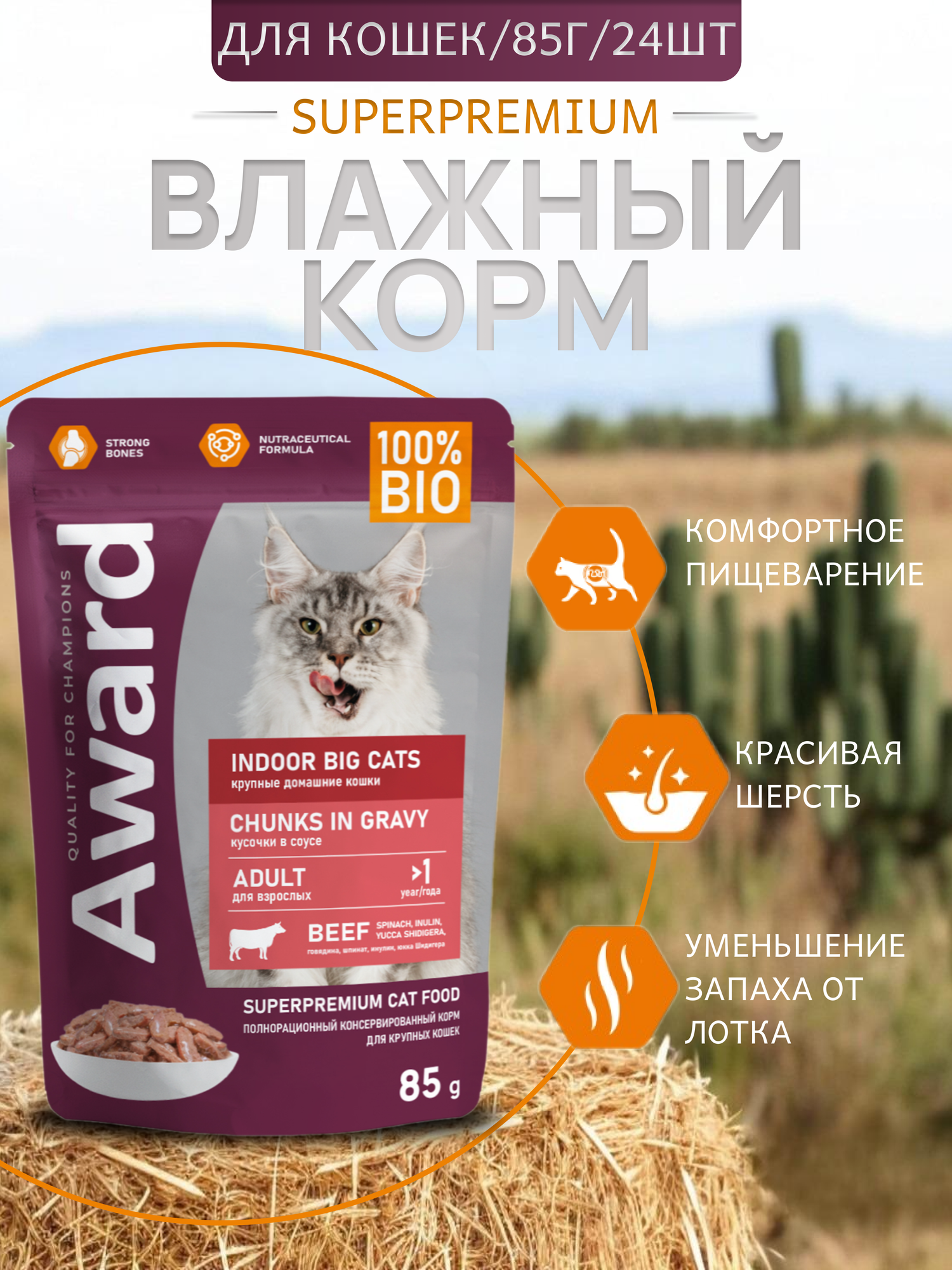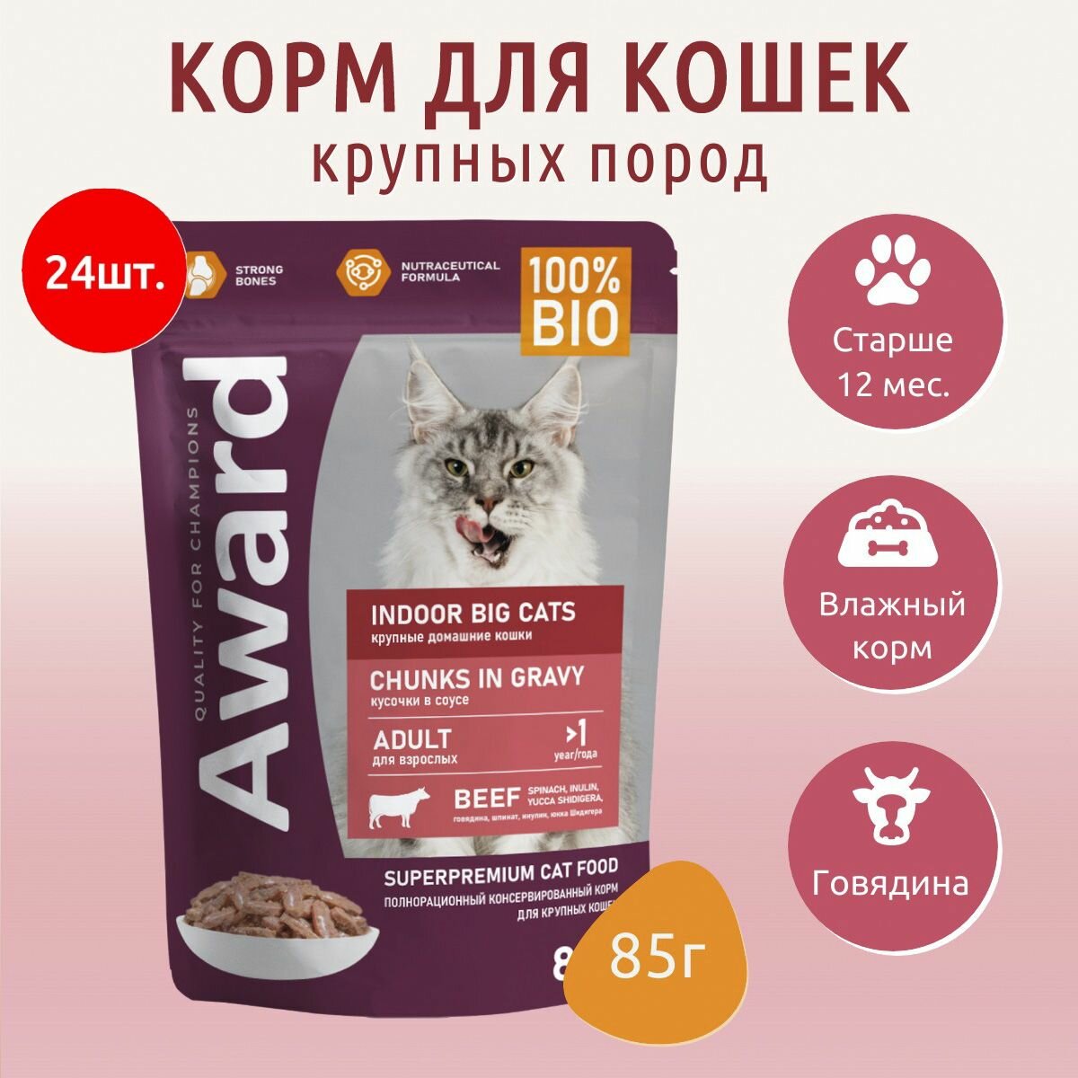 Корм влажный Award Indoor big cats для взрослых домашних кошек крупных пород кусочки в соусе с говядиной, 85г х24 шт.