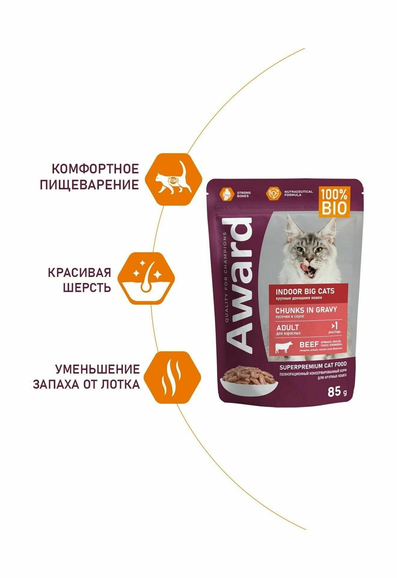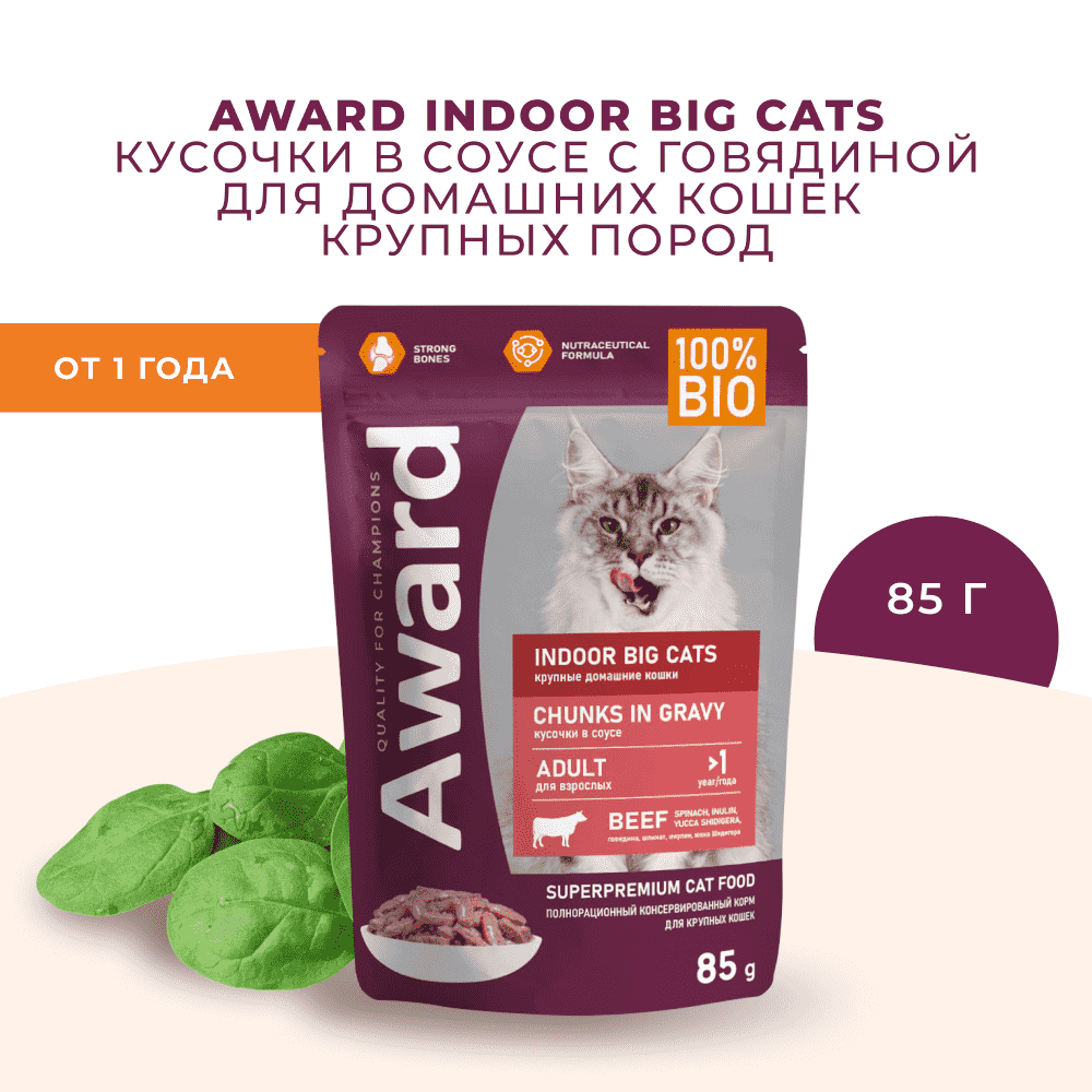 AWARD INDOOR BIG CATS BEEF для взр кош круп пород живущих дома с говядиной в соусе пауч 85 гр 85 гр х 6 шт