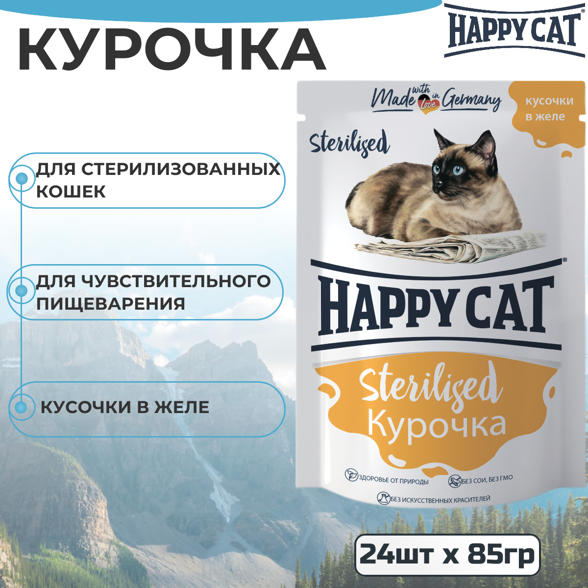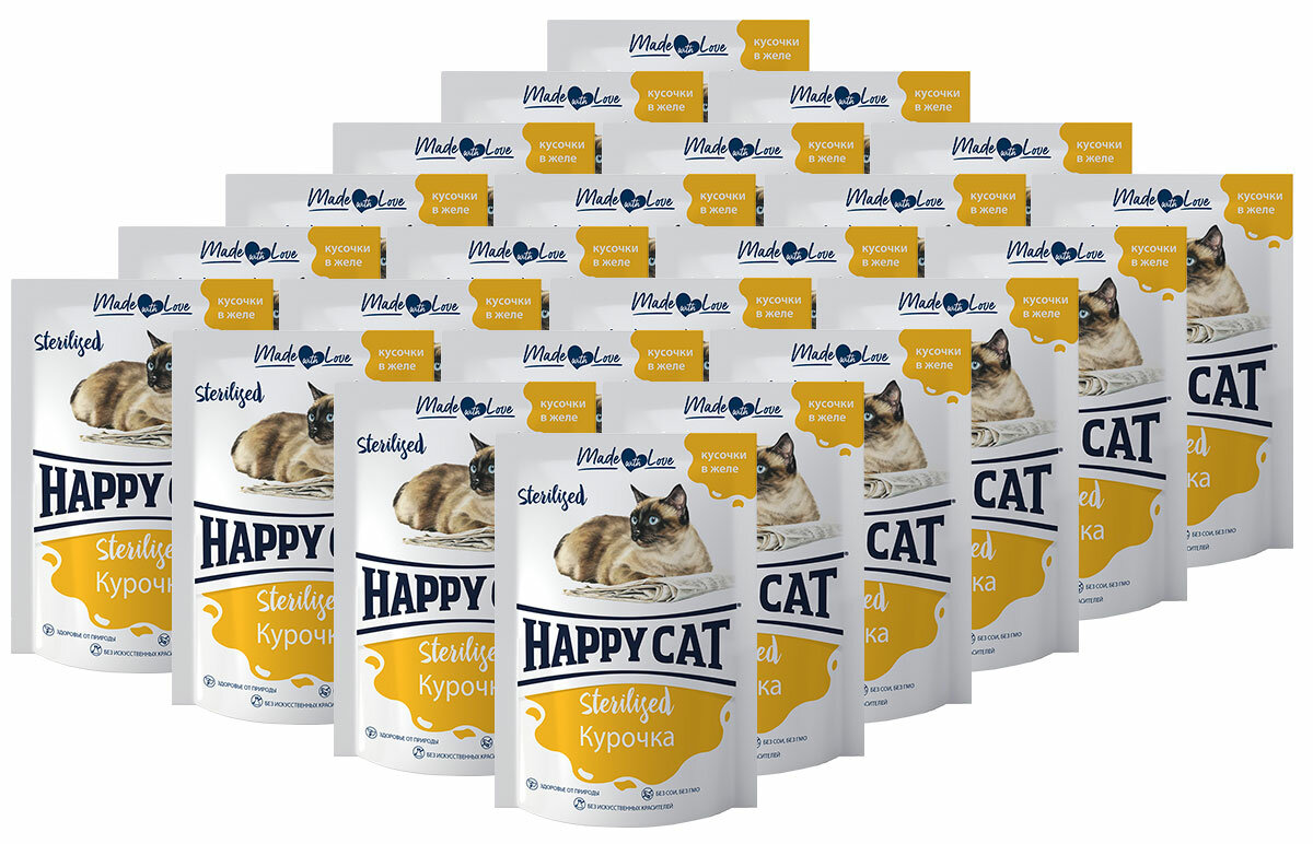 Купить Happy Cat паучи для взрослых стерилизованных кошек и кастрированных котов, с курочкой, кусочки в желе - 85 г х 24 шт