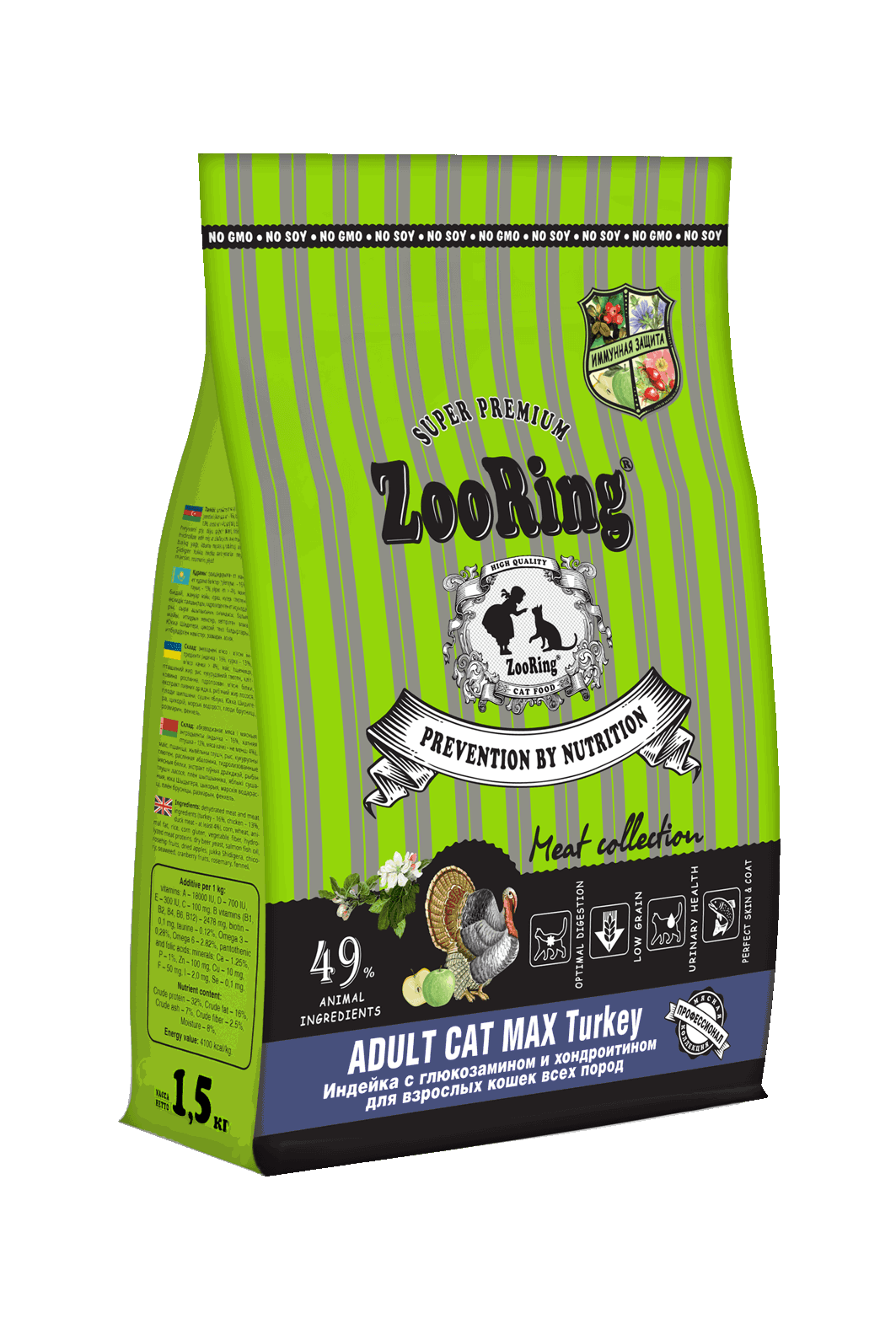 Сухой корм ZooRing ADULT CAT MAX TURKEY Индейка с глюкозамином и хондроитином для кошек, 1,5кг